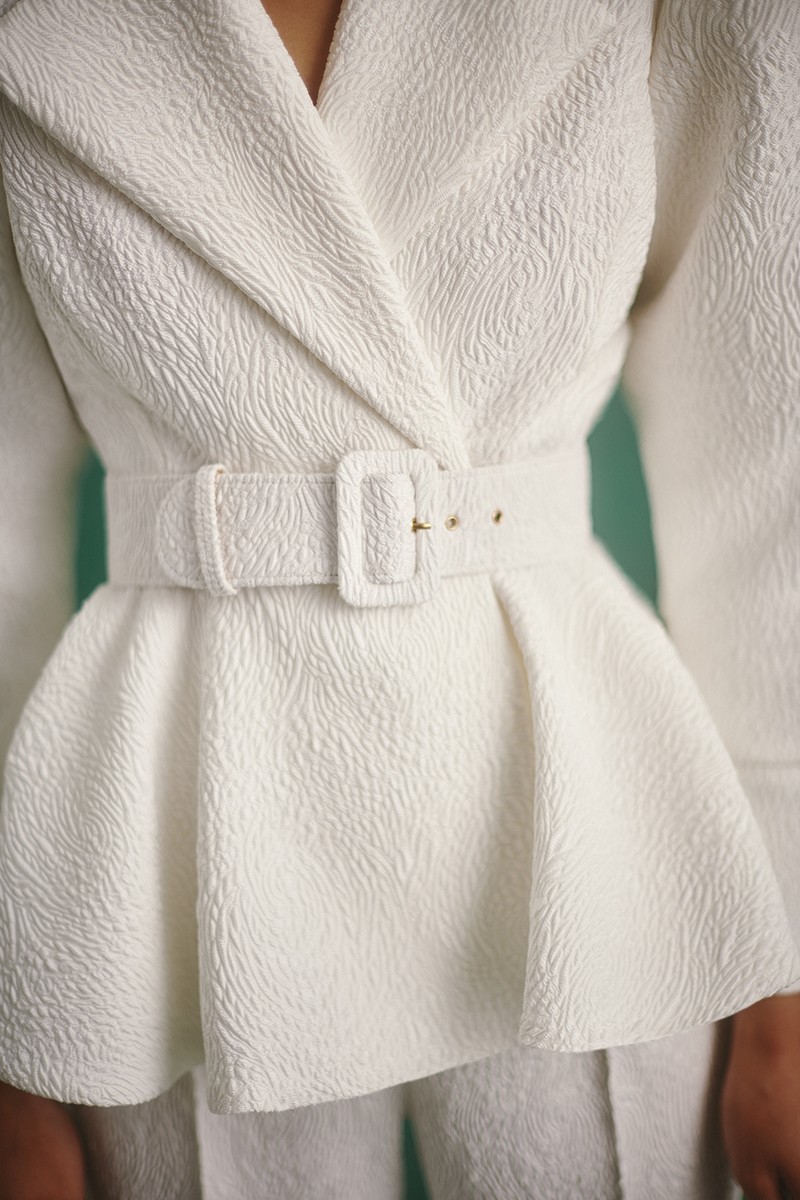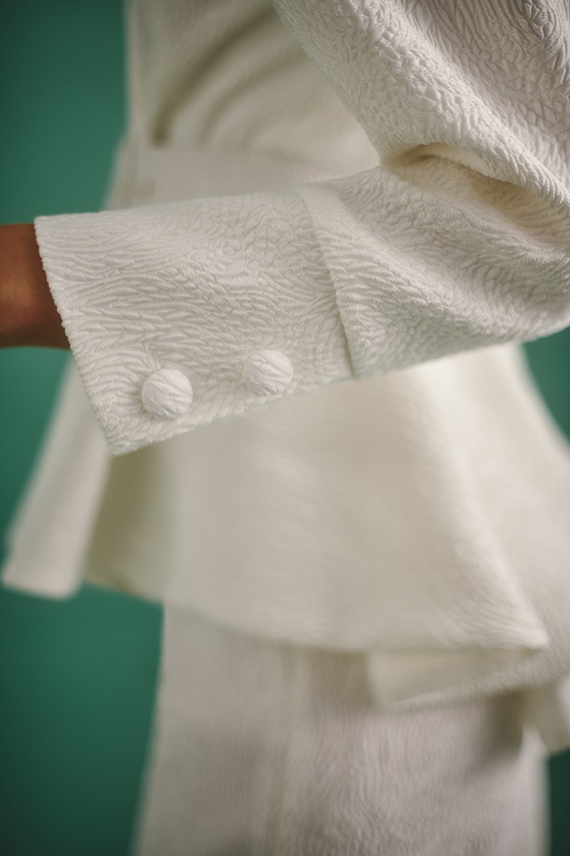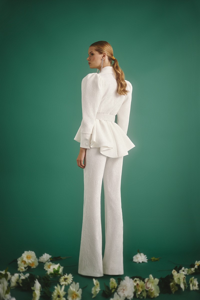 Traje formado por dos piezas, chaqueta y pantalón, confeccionado en un precioso tejido jacquard en color blanco. (...)