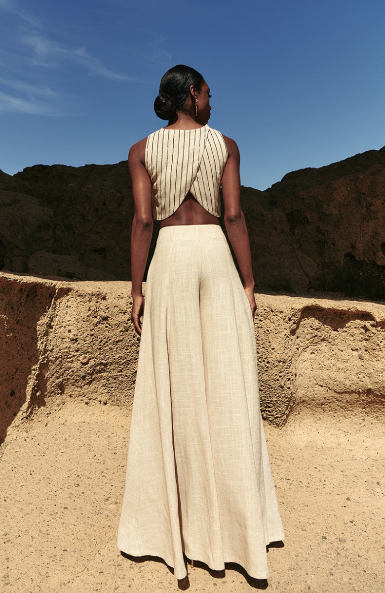 Precioso top confeccionado en tejido de lino beige con rayas de lentejuela en tono azul oscuro casi negro. (...)