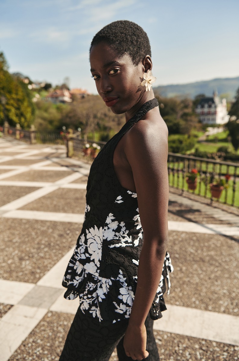 Espectacular top largo confeccionado en un tejido troquelado negro de excelente calidad con lentejuelas bordas blancas en forma de flor. (...)