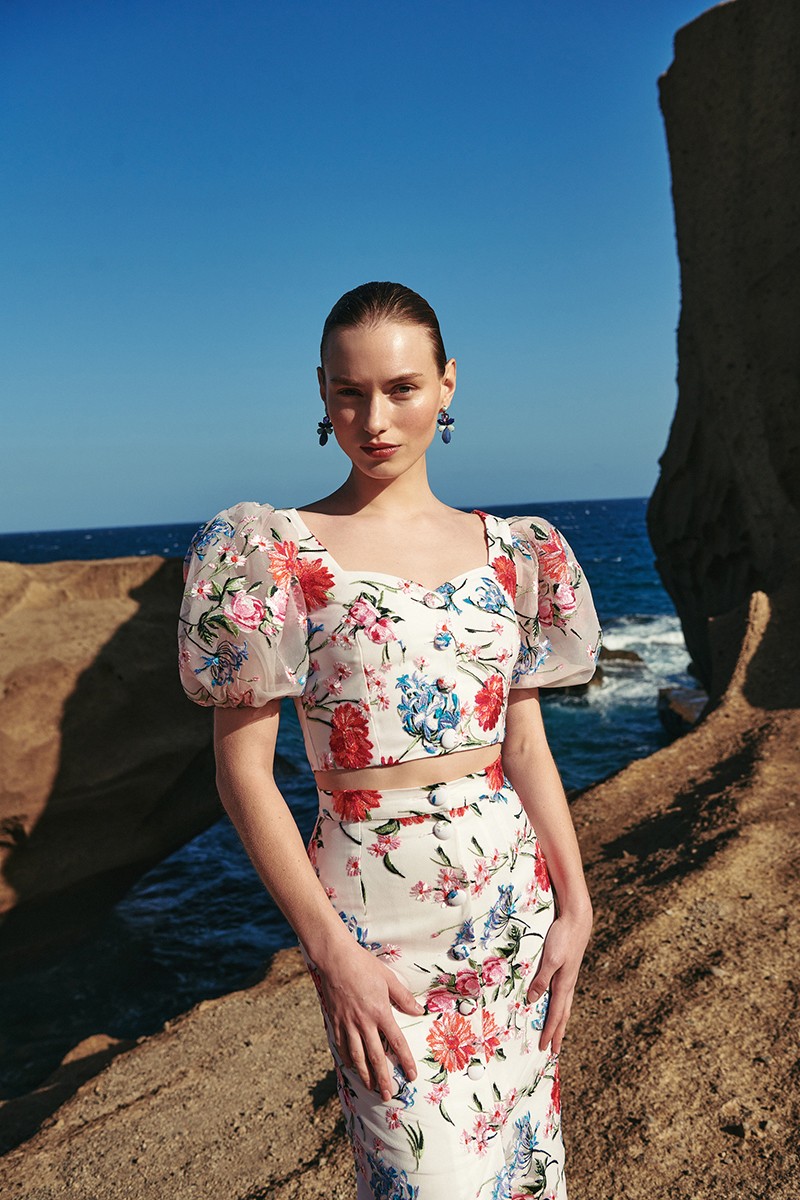 Falda confeccionada en un precioso tejido de tul bordado con estampado de flores con base de crepe blanco debajo. (...)