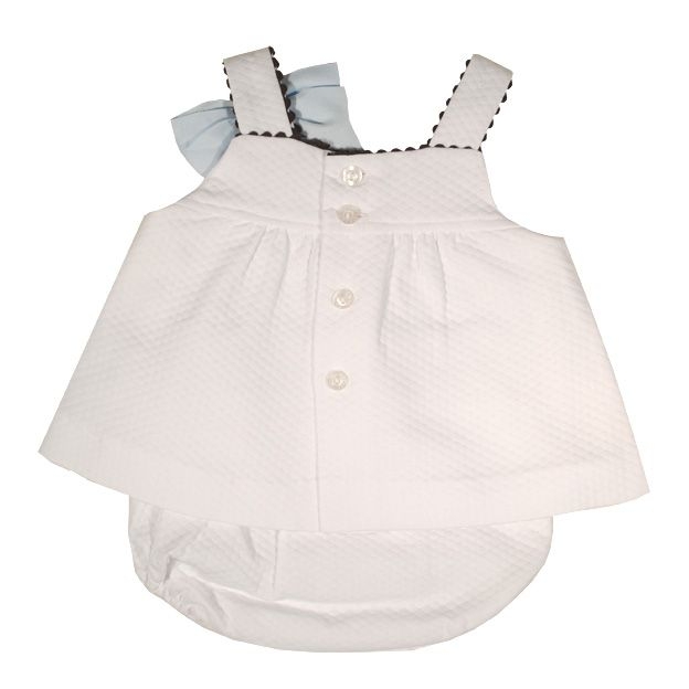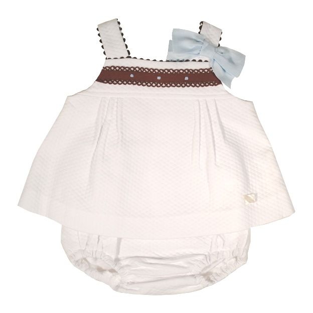 Conjunto de vestido y braguita blanco con detalles en marrón y lazo azul en tirante.Composición: 100% poliéster