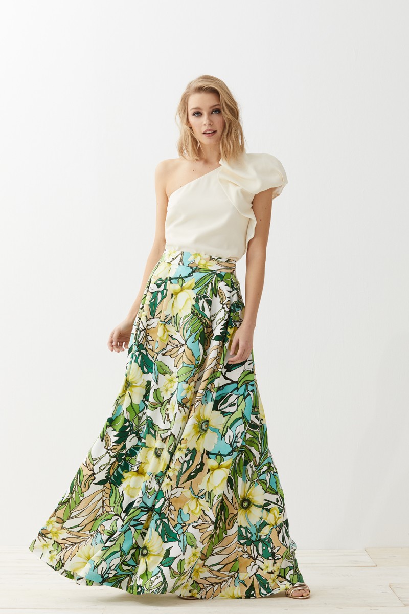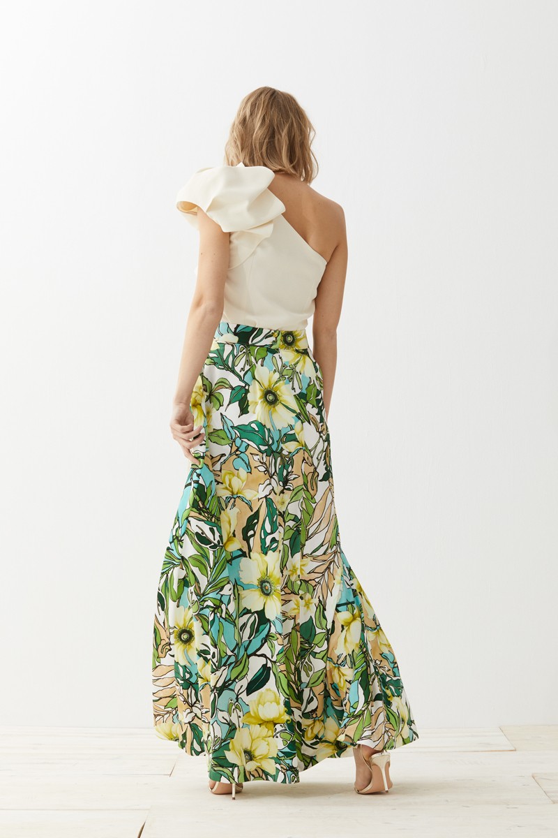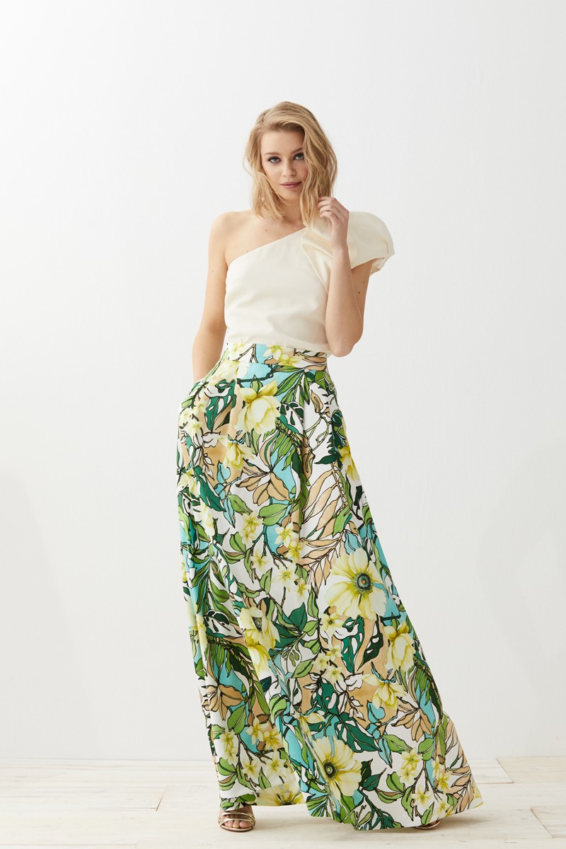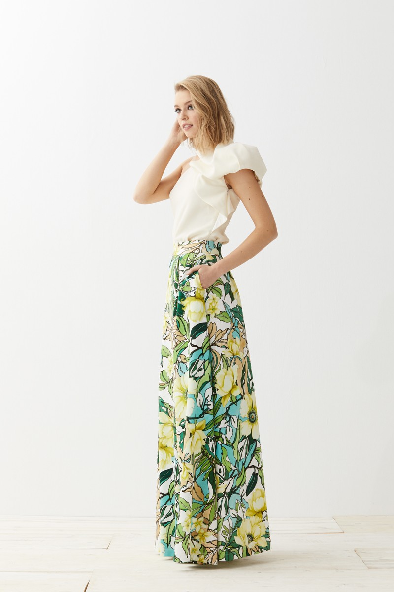 Falda larga de vuelo confeccionada en piel de ángel en la que destaca un precioso estampado de flores en colores verdes marrones y azules. Forro interior. Bolsillos (...)