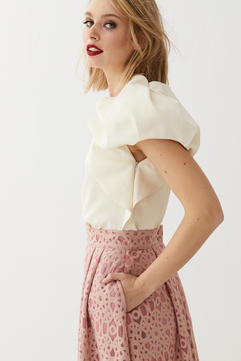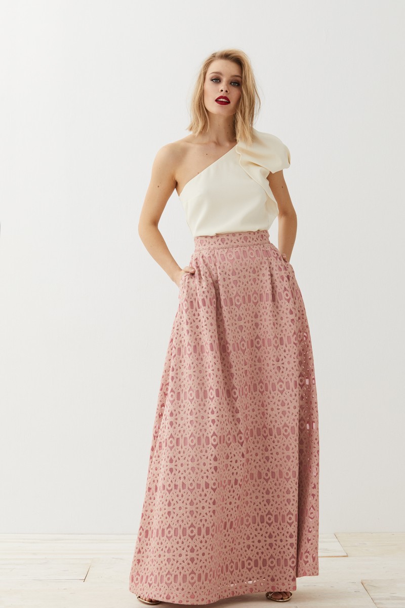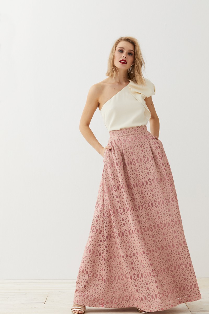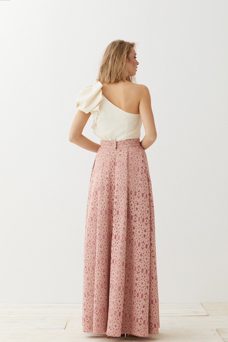 Falda larga de abullonada confeccionada en un precioso tejido brocado combinado con encaje. (...)