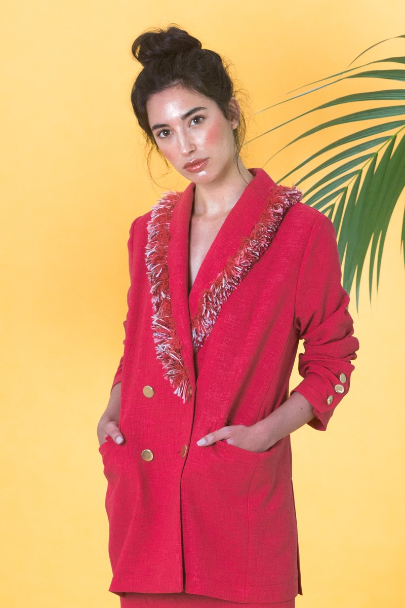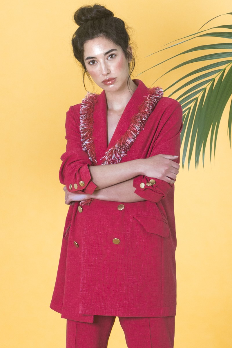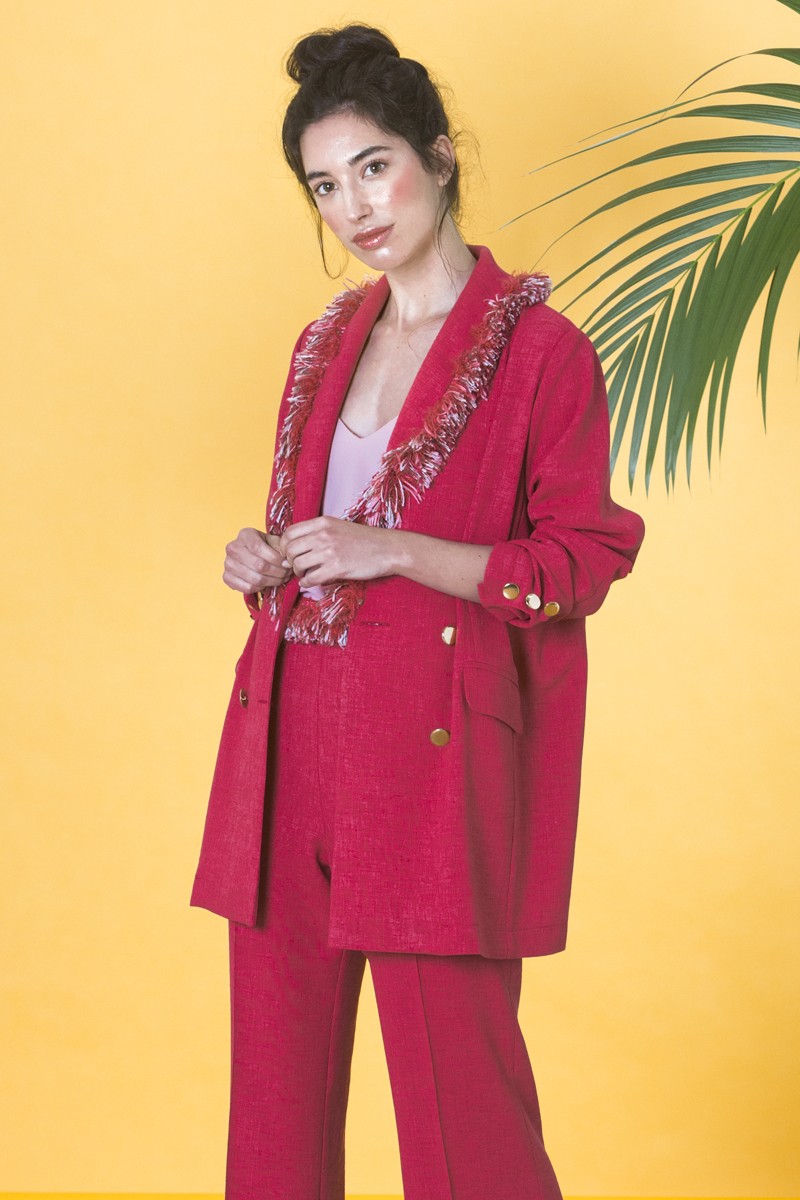 Preciosa chaqueta americana con doble botonadura dorada y bolsillos confeccionada en tejido de rafia en color rojo fresa. (...)