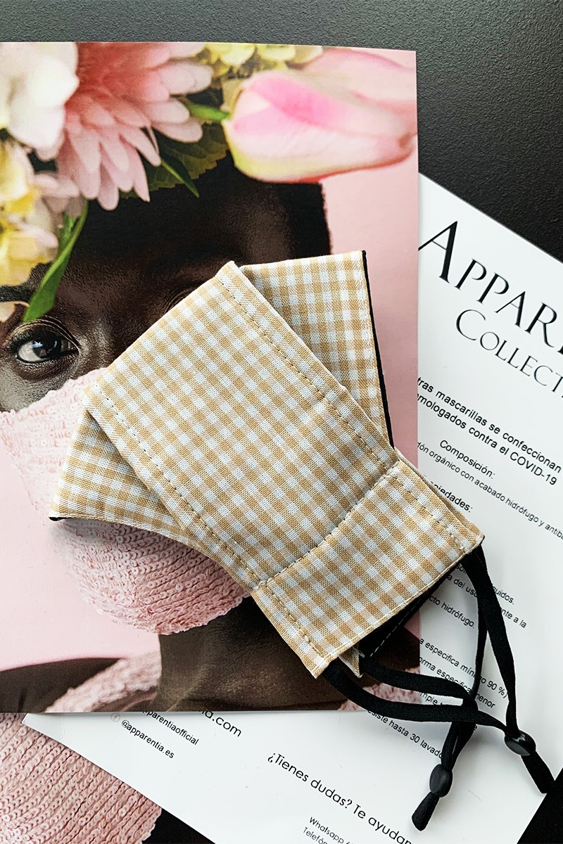 Mascarilla homologada de cuadros vichy pequeño con diseño de 3 dimensiones con pieza horizontal y zona de los ojos más despejada. Gomas laterales ajustables.