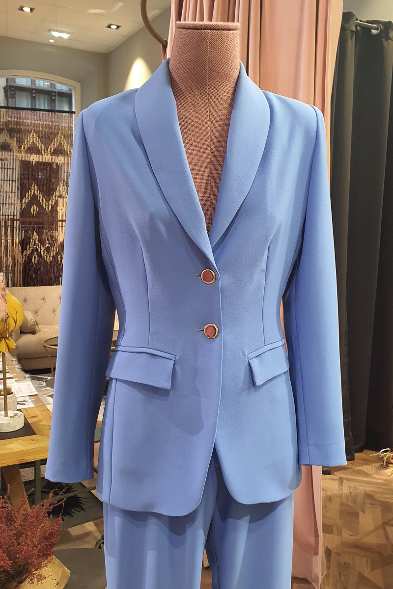 Precioso traje de chaqueta y pantalón confeccionado en crepe azul. La americana viene con doble botón forrado, tapetas y cuello esmoquin. Totalmente forrada. (...)