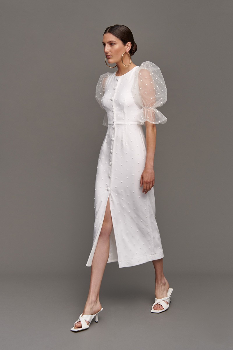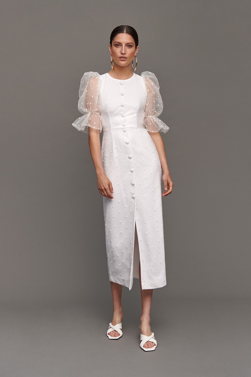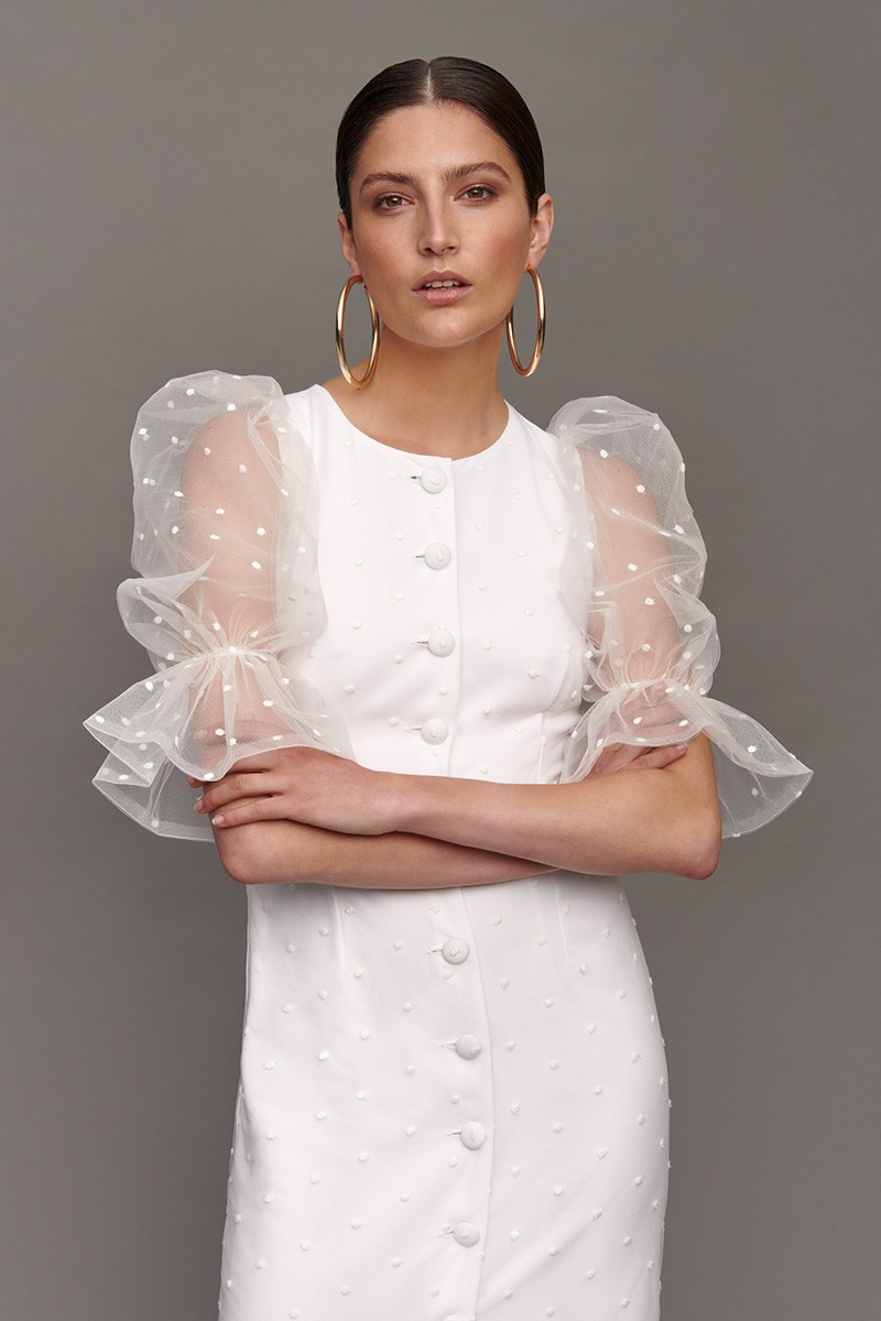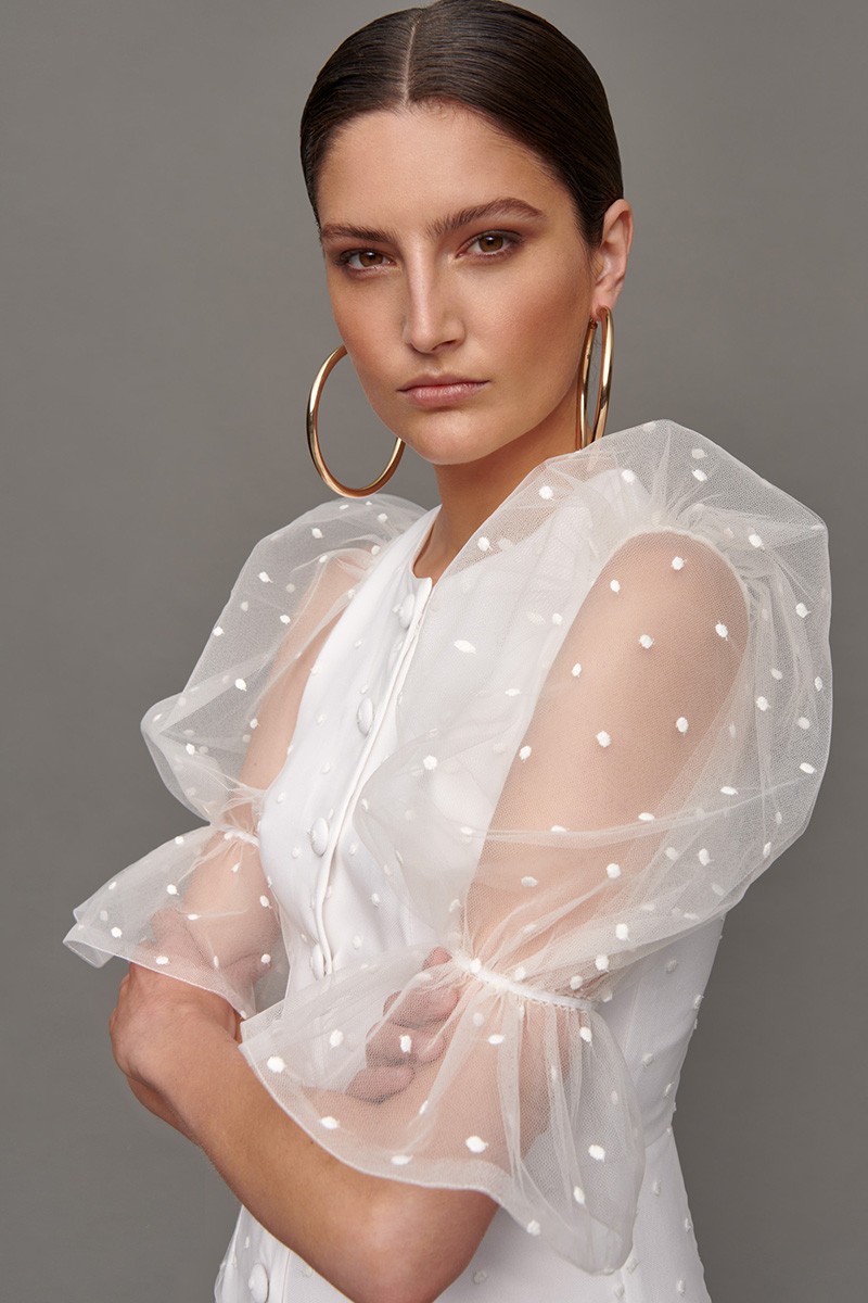 Precioso Vestido confeccionado en tul con plumetti bordado de punto grueso, sobre una base de crepe blanco roto. (...)