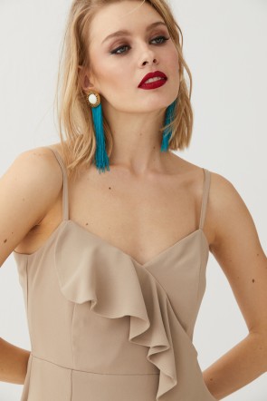 Vestido corto tipo esmoquin confeccionado en tejido de crepe de alta calidad en color camel. Corte entallado que estiliza y favorece la figura femenina. Un precioso vestido en el que destaca su forma de chaqueta americana con el escote en pico y cuello con solapa de manga larga y preciosos flecos que comienzan a la altura de la cadera y llegan hasta la rodilla, otorgándole a la prenda un grácil balanceo.