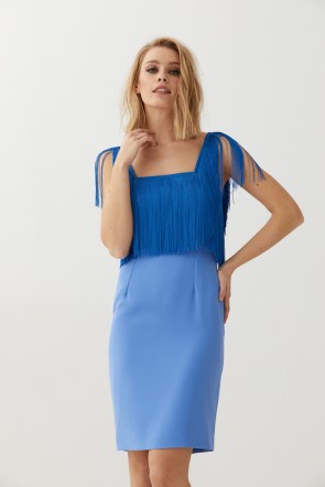 Vestido corto recto confeccionado en crepe de color azul con flecos. ¡Ideal para acudir a una comunión!
