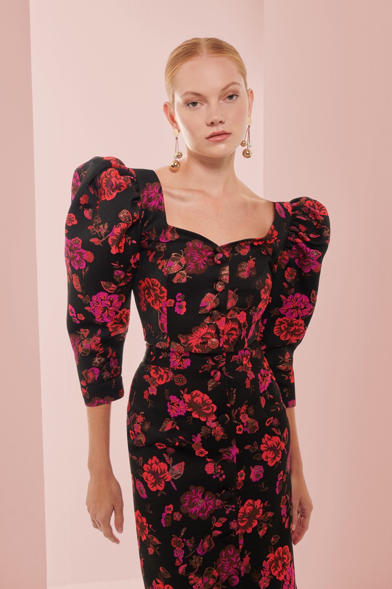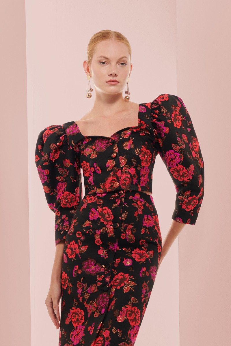 Precioso top confeccionado en jacquard brocado negro con estampado de flores. (...)