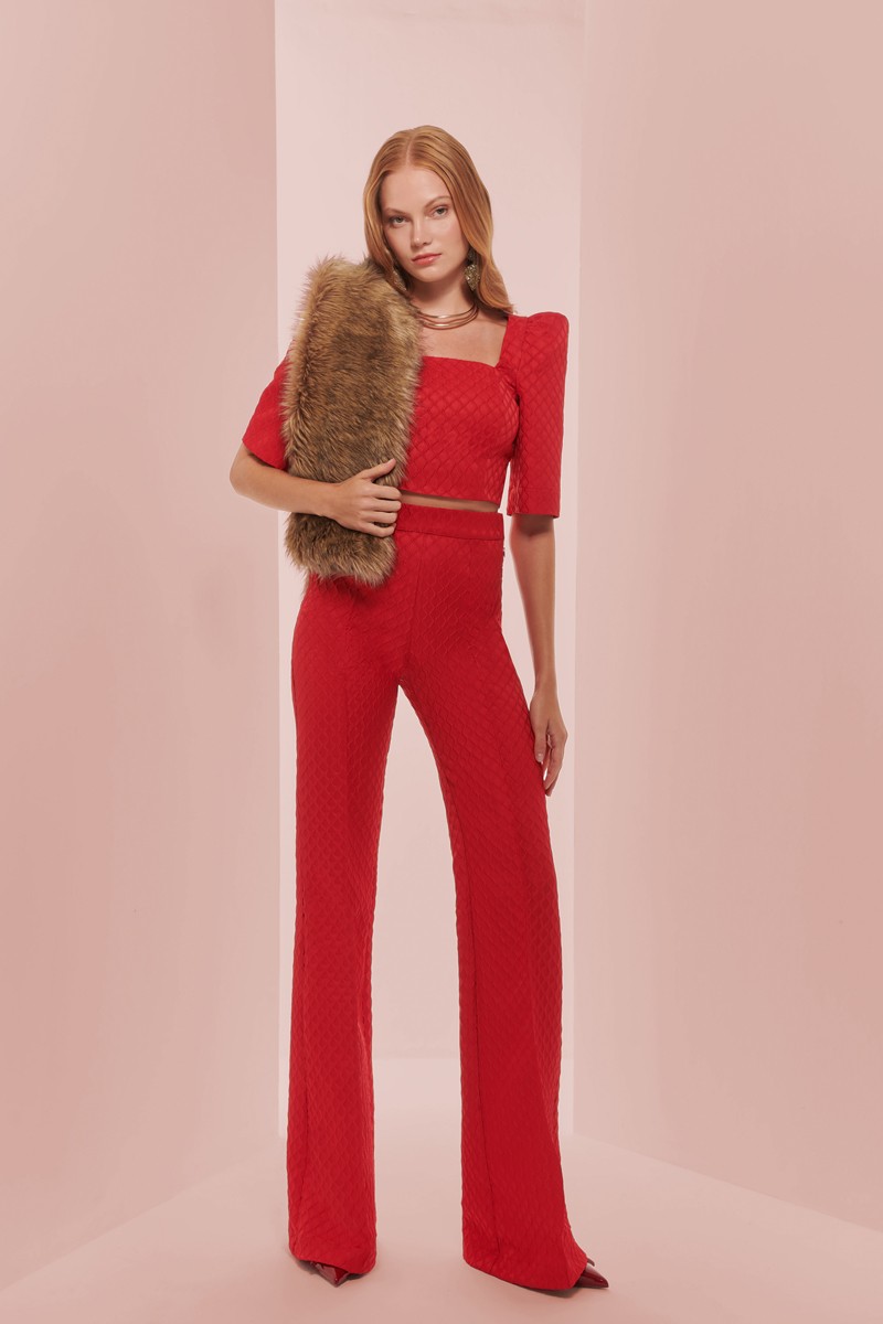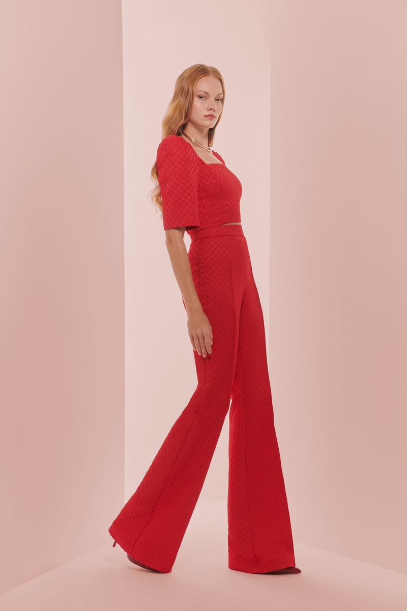 Pantalón de tiro alto con feccionado en un tejido jacquard brocado rojo con dibujo geométrico de rombos de la máxima calidad. (...)