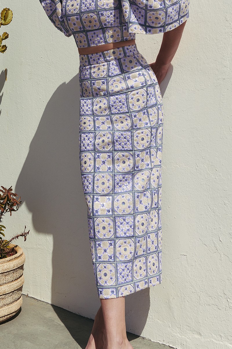 Preciosa falda midi recta confeccionada en un tejido bordado con estampado en cuadrados con lentejuelas en tonos beige y azules. (...)