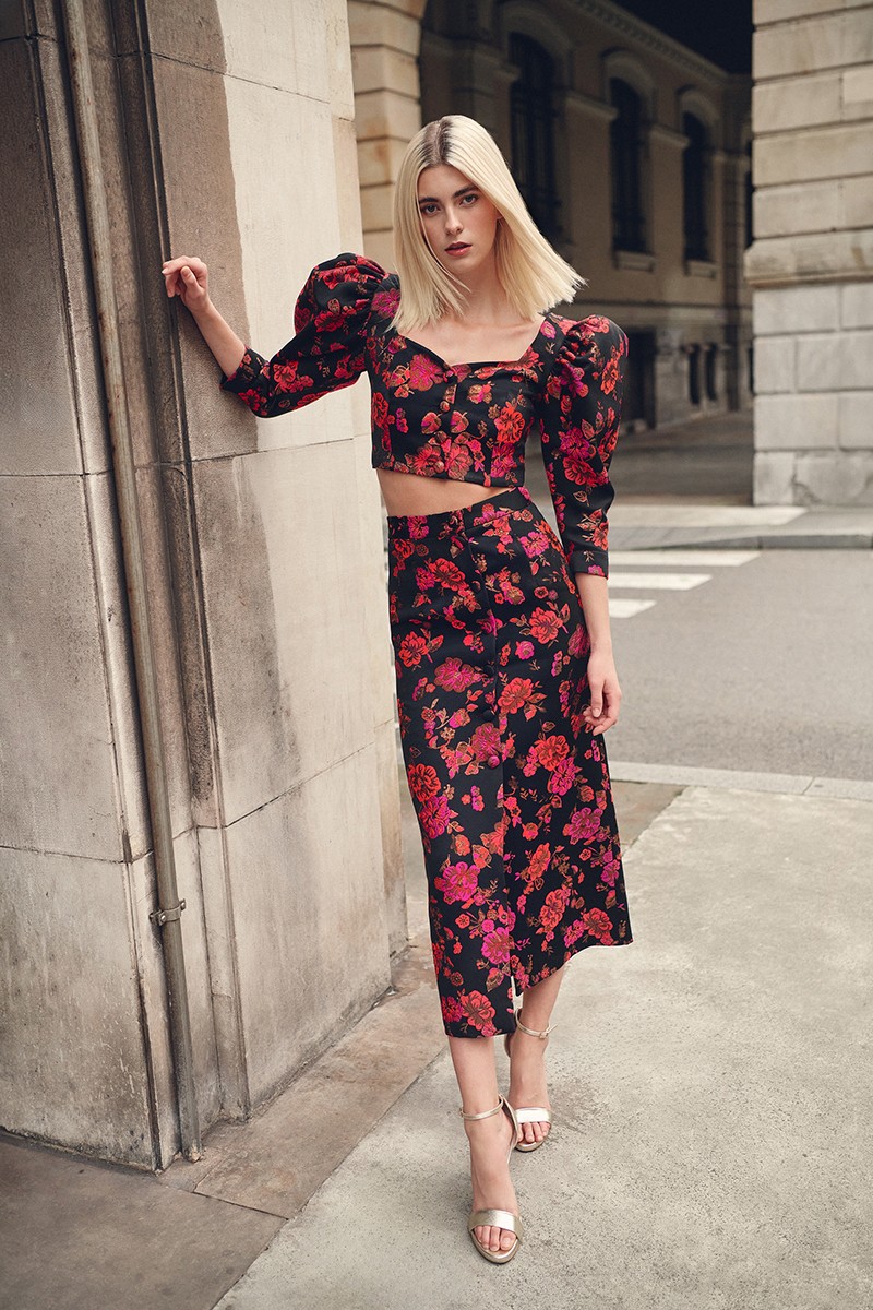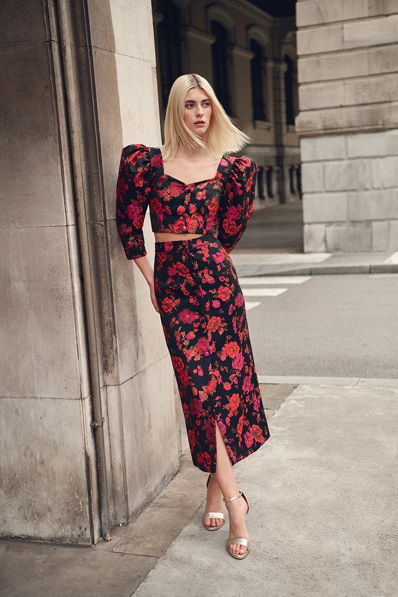 Preciosa falda confeccionada en un tejido jacquard brocado negro de flores de la máxima calidad. (...)