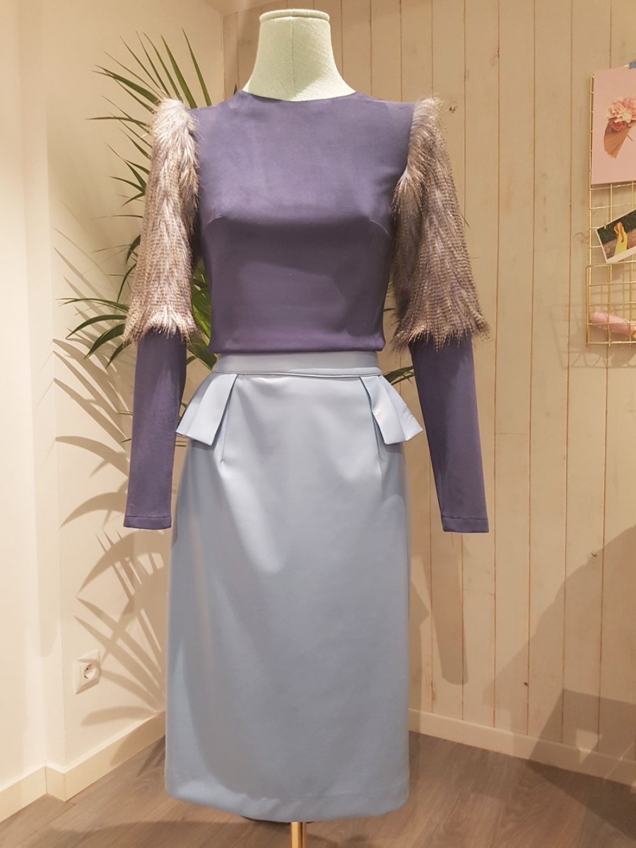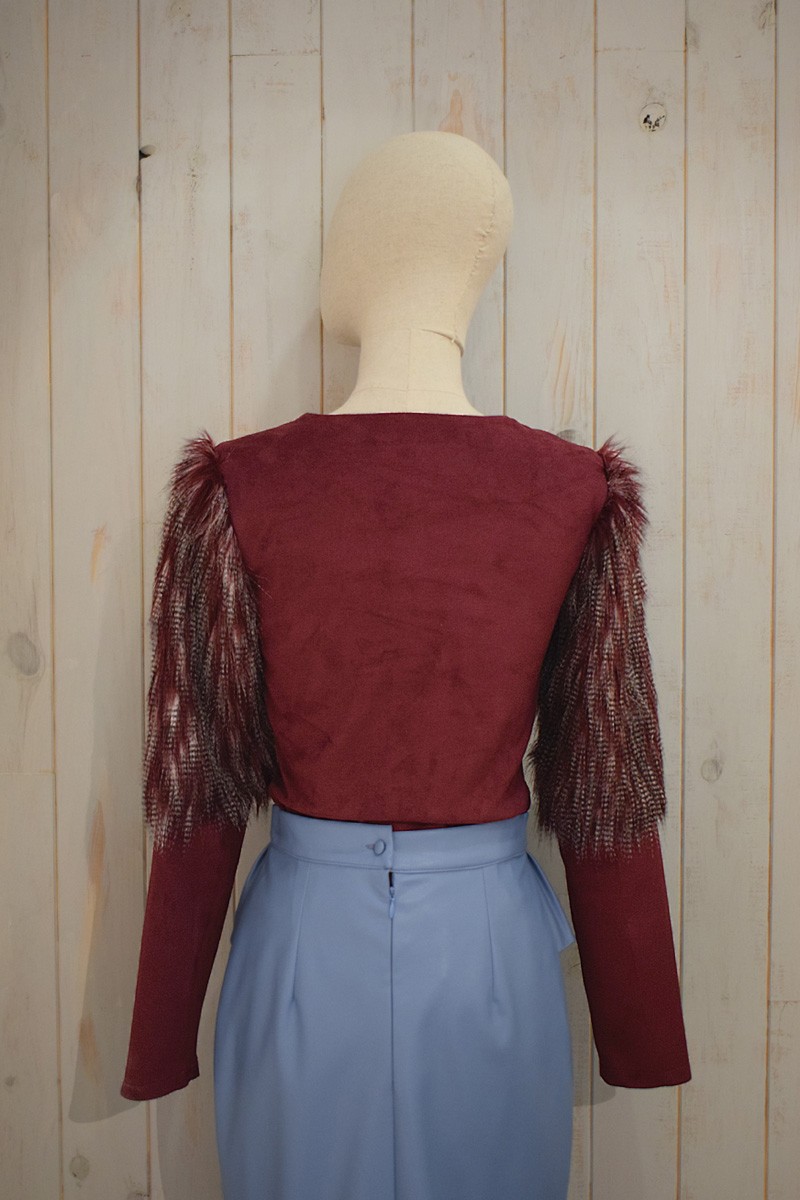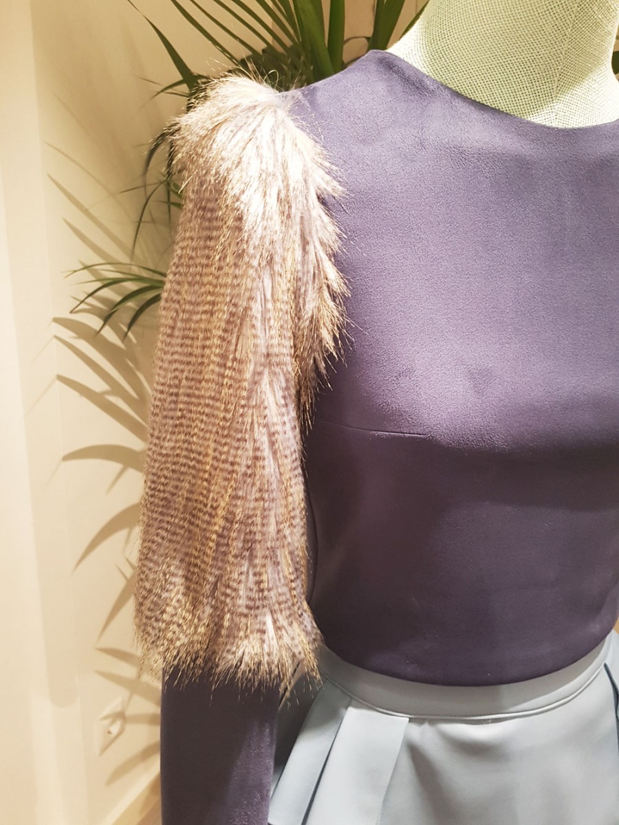 Jersey confeccionado en ante en color beige de manga larga. Estiliza mucho la figura porque el largo llega hasta la cintura. Desde los hombros hasta el codo está forrado con pelo largo (...)