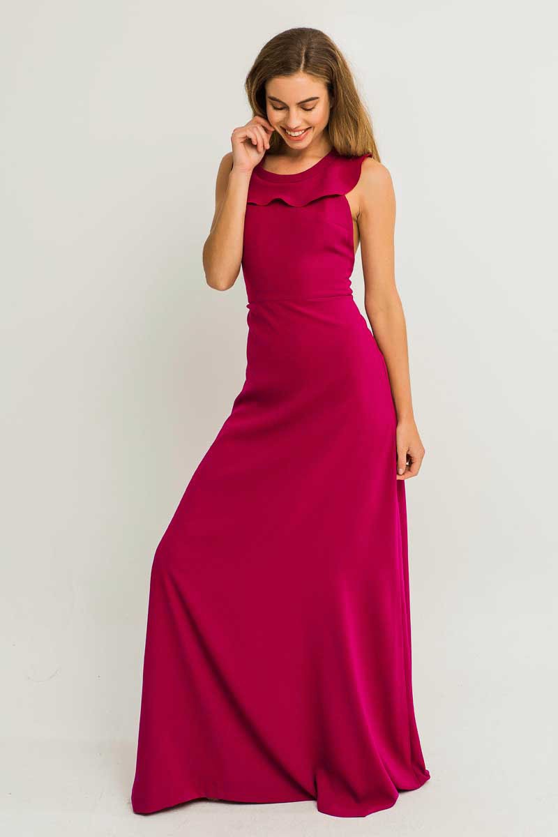 Vestido largo confeccionado en crepe satén de excelente calidad. Cuello redondo de volantes que continúan por el centro de la espalda hasta el bajo de la falda, jugando con su acabado (...)