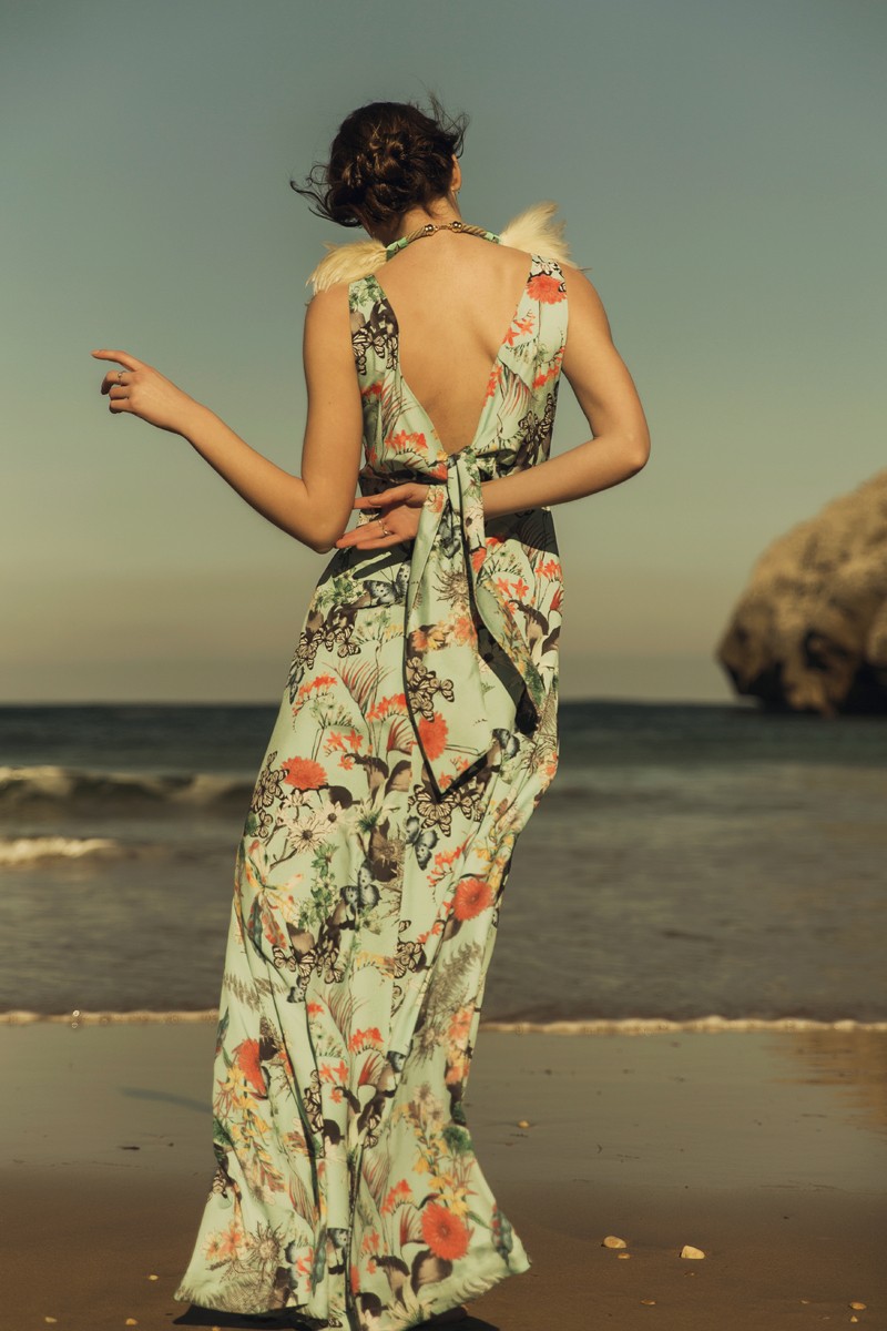 Maravilloso vestido largo azul claro con estampado de mariposas y flores, confeccionado en crepe satén de excelente calidad. Sin mangas. Cuello a la caja y lazada en la espalda que aporta (...)