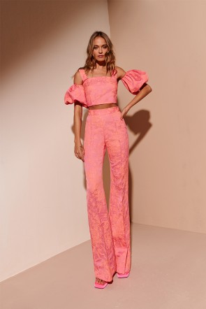 Elegante pantalón estrecho confeccionado en crepe de color rojo con volante de forma asimétrica que comienza más abajo de la rodilla y llega a alcanzar la altura del tobillo. (...)