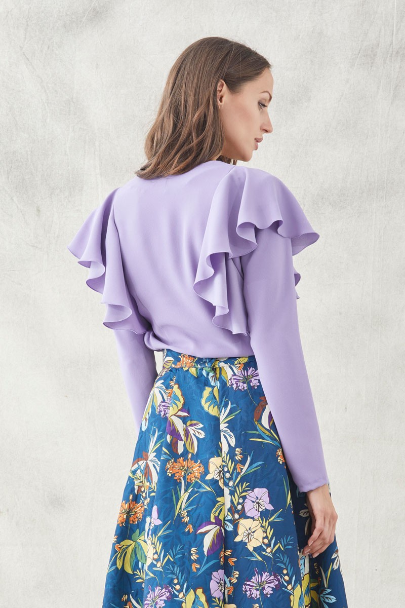 Blusa lila confeccionada en crepe de excelente calidad con manga larga y un volante rodeando el hombro con una preciosa caida. Escote en pico en la parte delantera y cerrado en la espalda. (...)