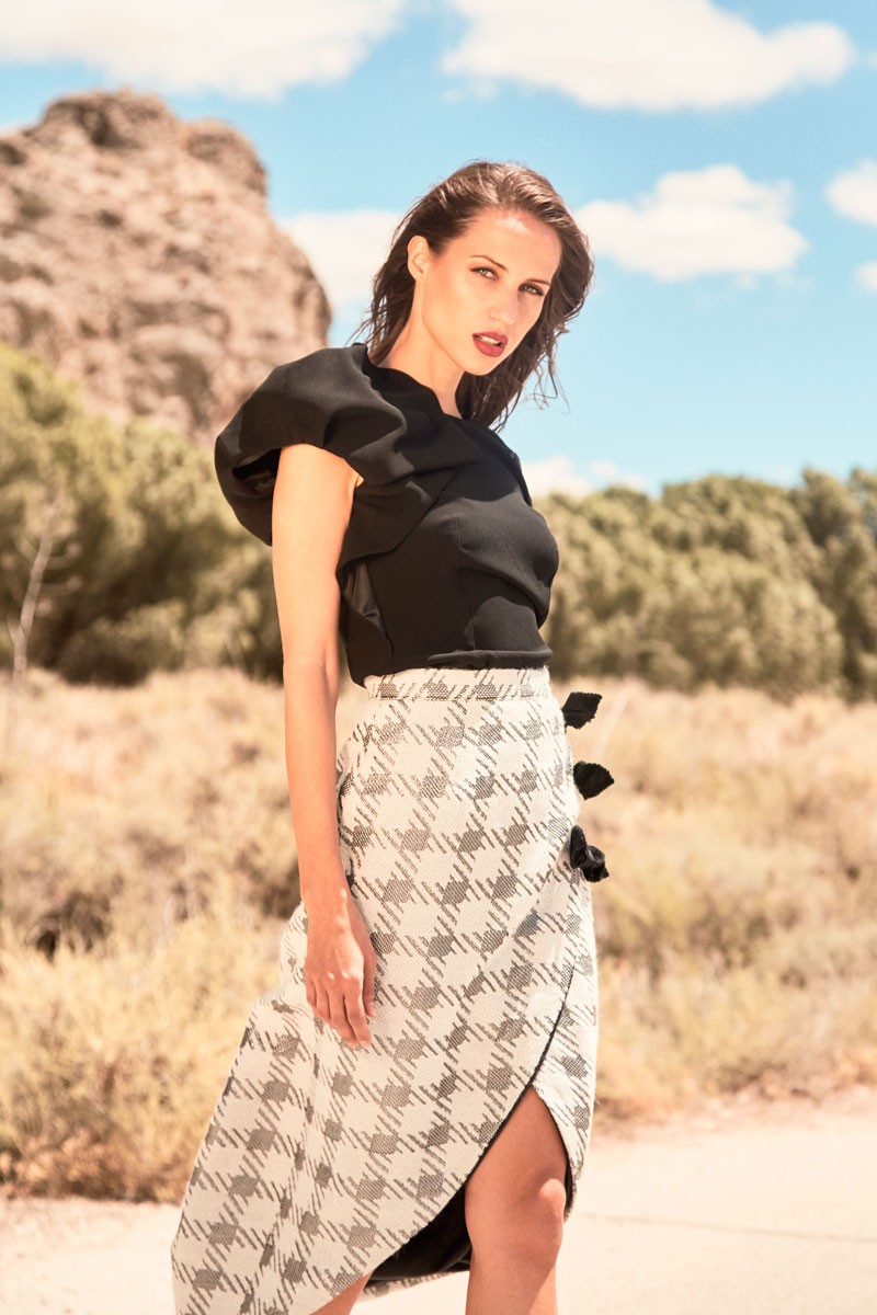 Top de mangas asimétricas confeccionado en tejido de crepe negro. Diseño versátil con mangas asimétricas, una larga y la otra abullonada. Forro interior y cierre con (...)