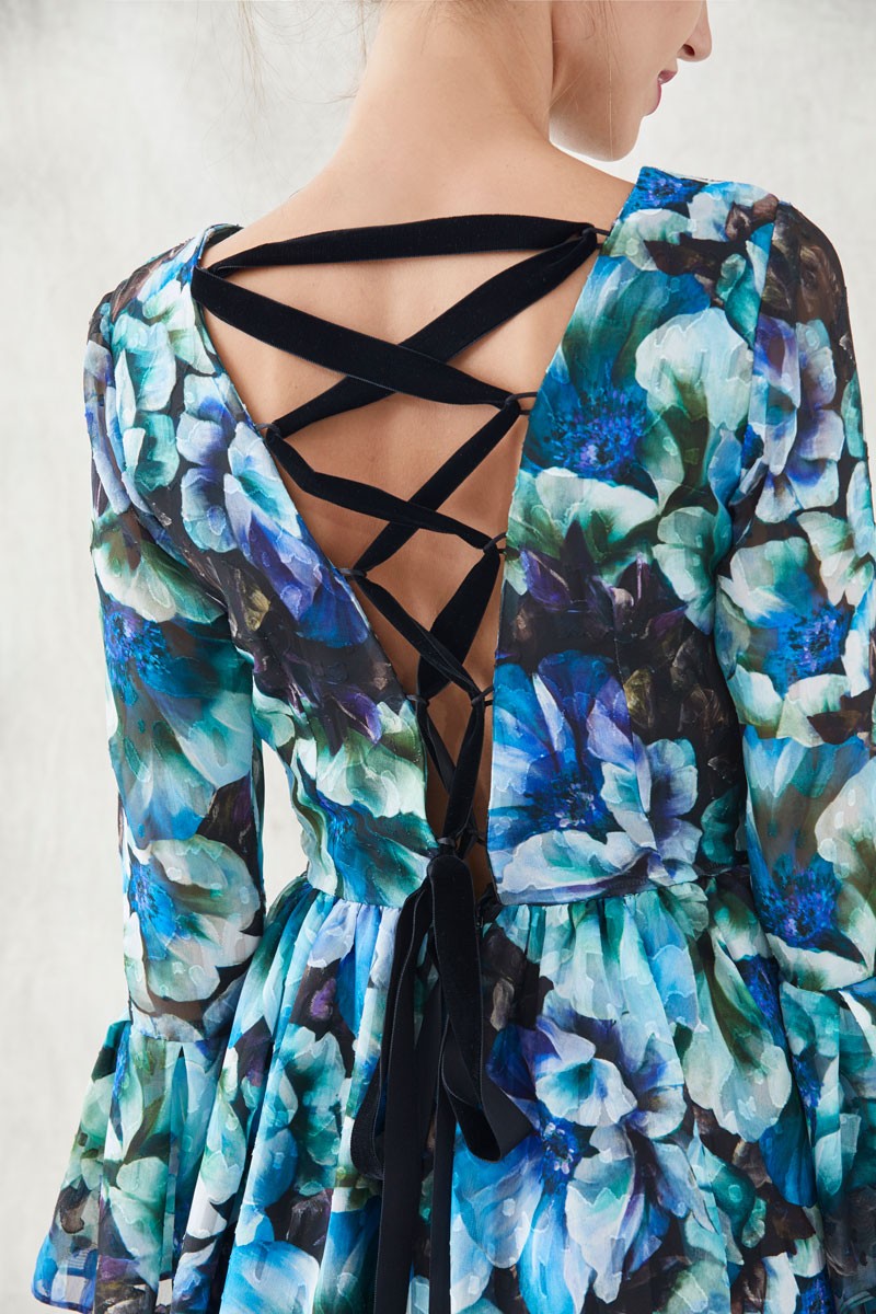 Increíble vestido corto confeccionado en crepe devoré con estampado de flores en tonos verdes, azules y morados. Destaca en una preciosa tira de terciopelo negra cruzada que termina en (...)