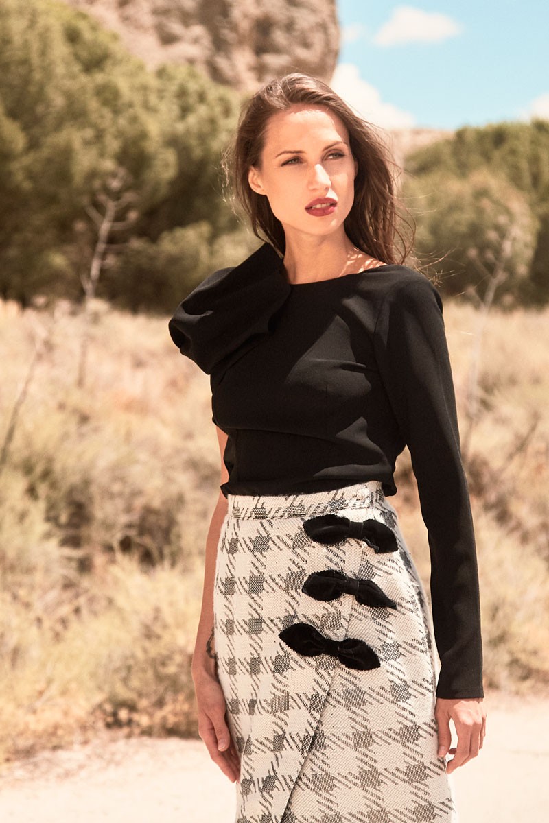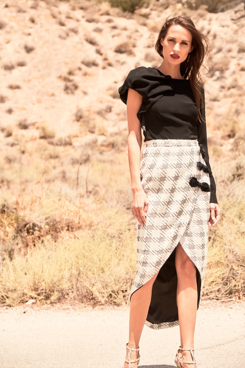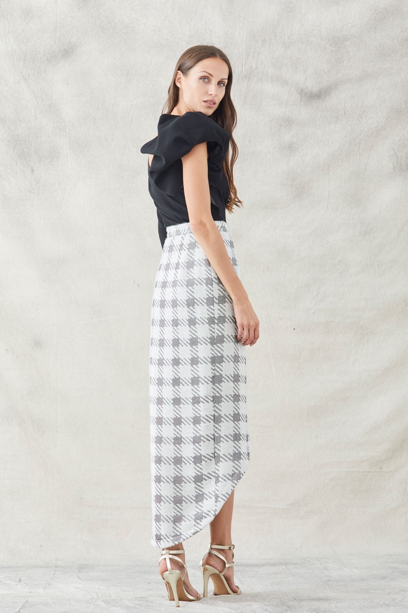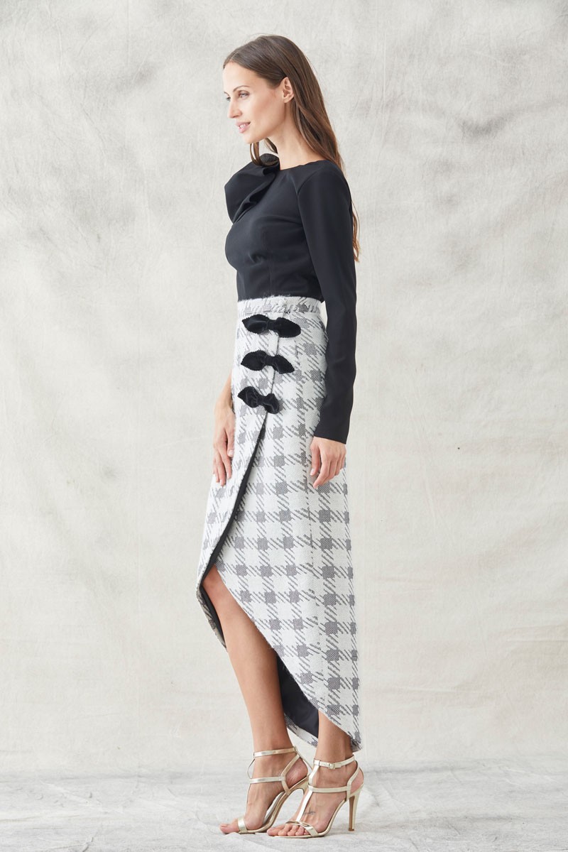 Elegante falda midi asimétrica confeccionada en tejido de pata de gallo en tonos blanco y gris. Cruzada en la parte delantera y enriquecida con el detalle de tres lazos de terciopelo (...)
