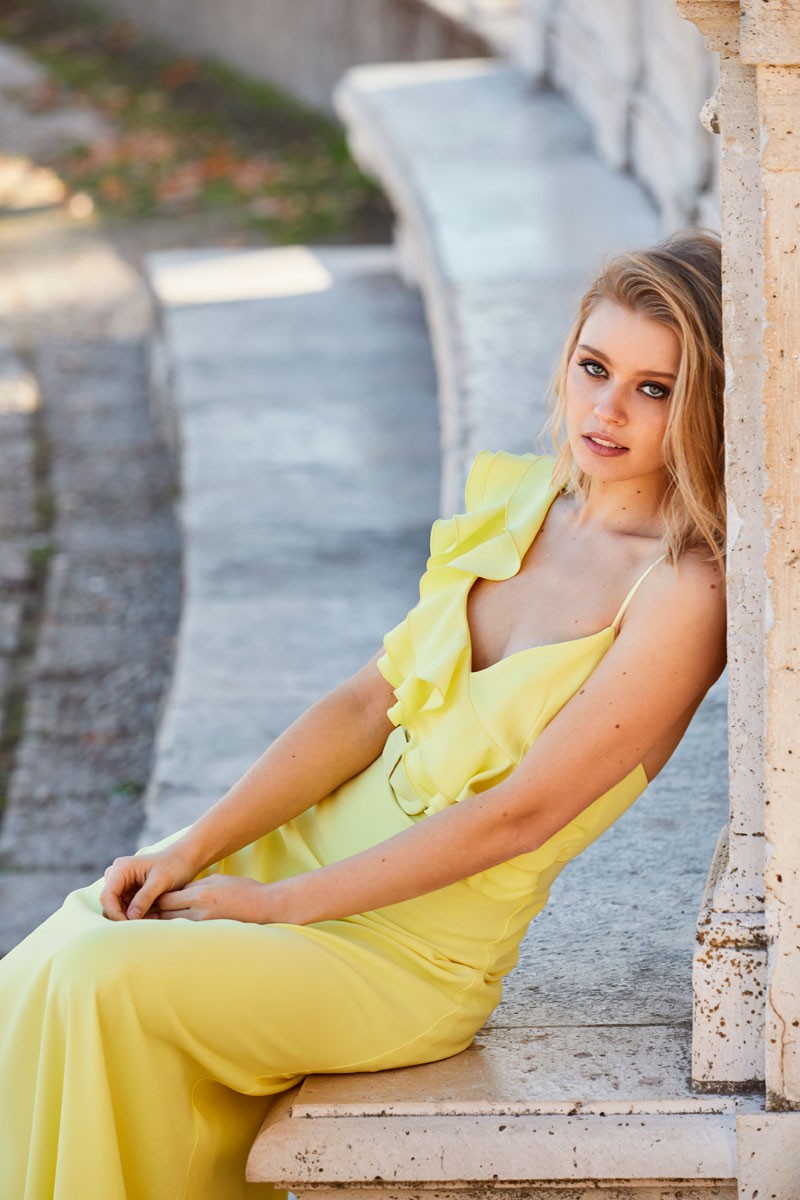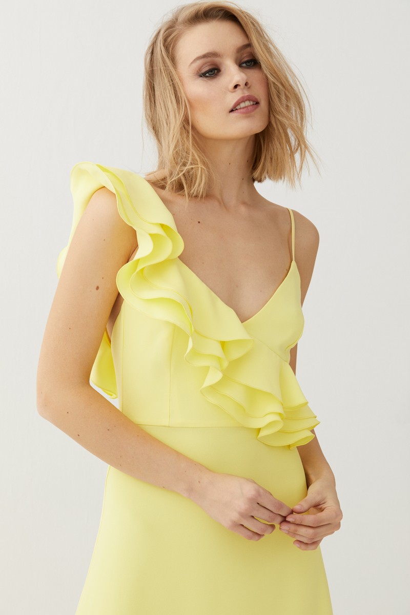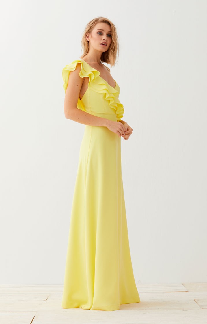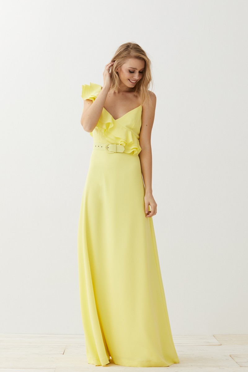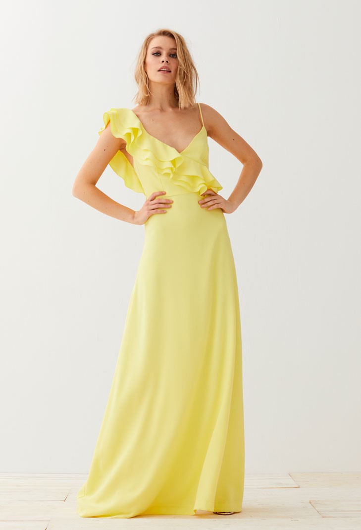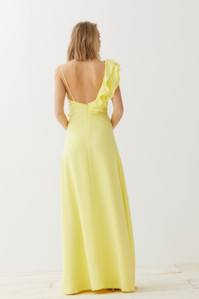 Precioso vestido largo en color amarillo lima de tirantes con escote en pico. Uno de los hombros queda prácticamente al aire, solo cubierto por un tirante espagueti y sobre el otro caen (...)