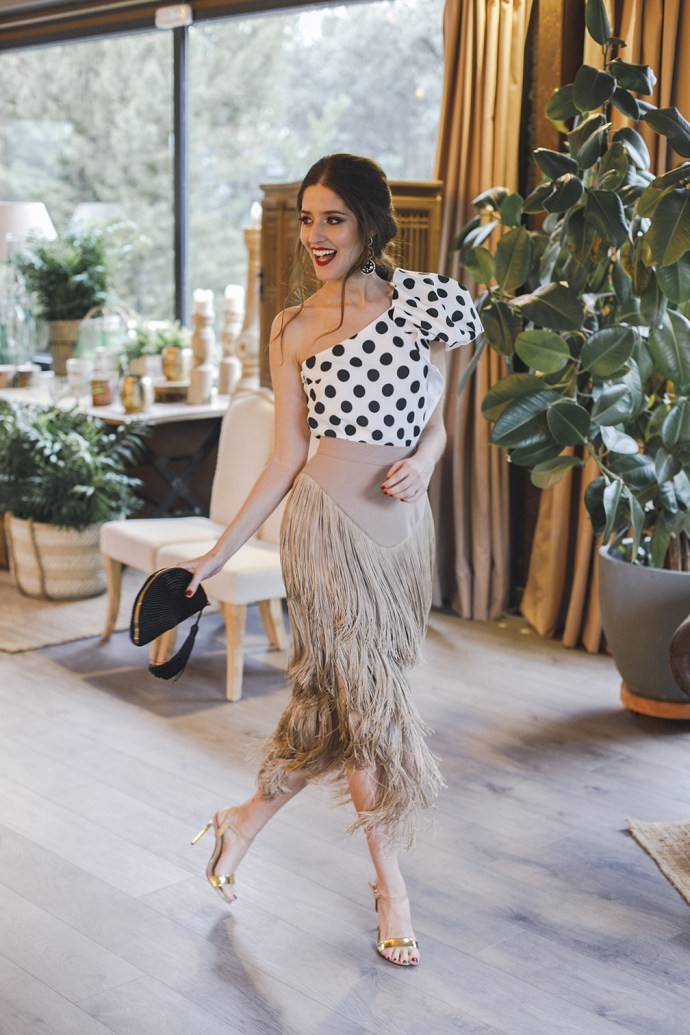 Preciosa Falda de Flecos en color camel de corte midi. Una maravillosa falda entubada cuya base está confeccionada en crepe de color camel y en la que destacan los flecos de (...)