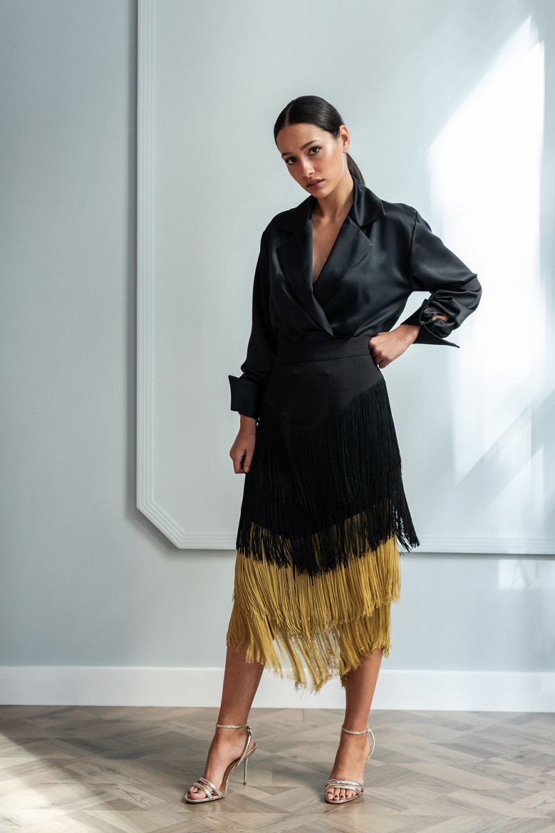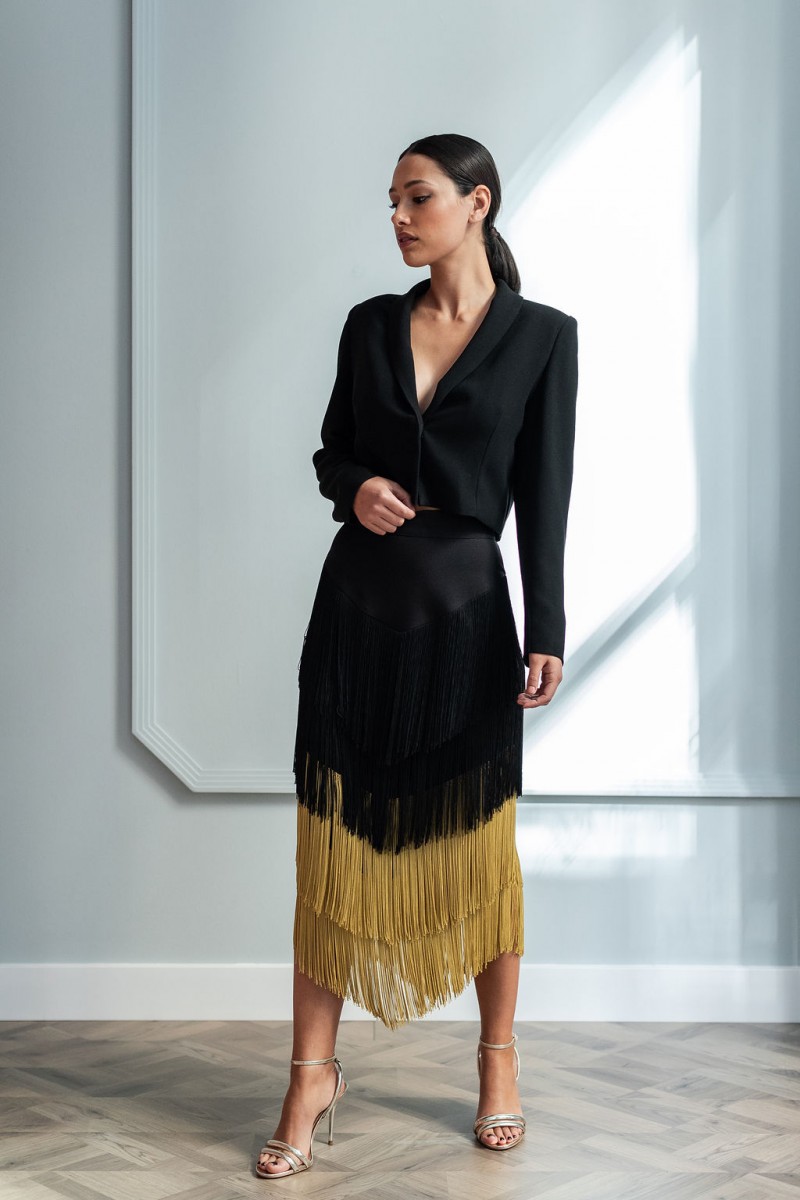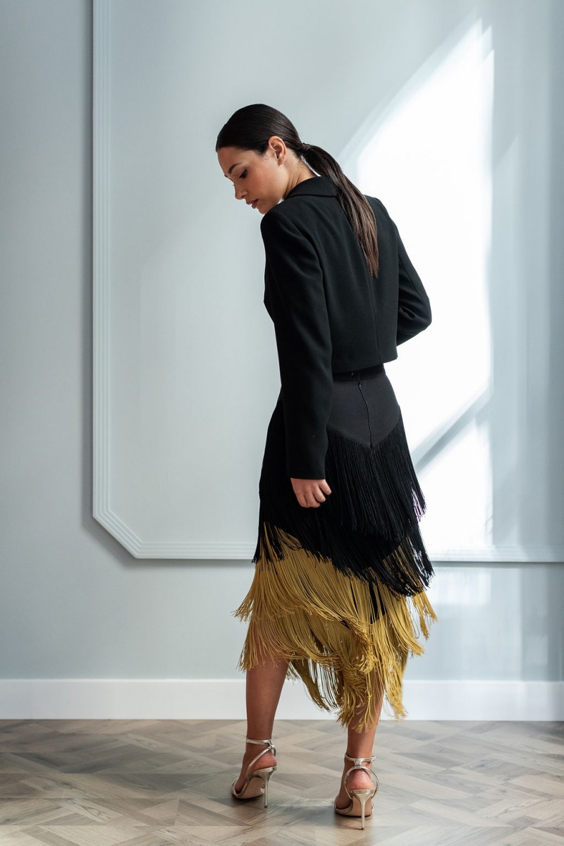 Preciosa Falda de Flecos en que combina los colores negro y mostaza de corte midi. Una maravillosa falda entubada cuya base está confeccionada en crepe de color negro y en la que destacan los (...)
