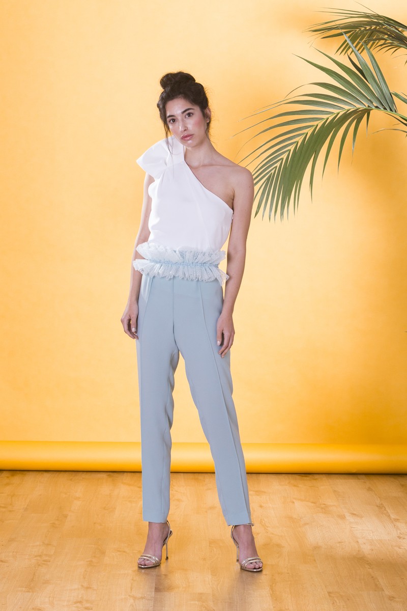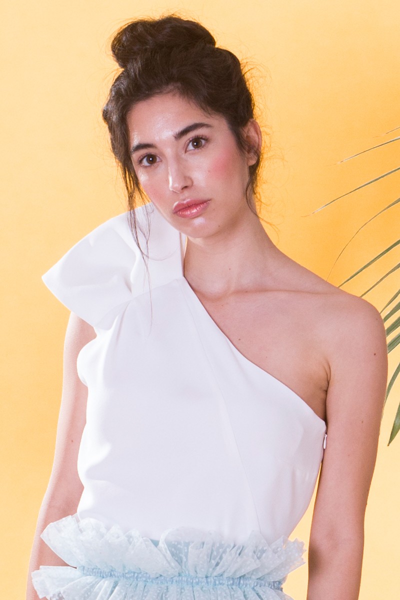 Top asimétrico confeccionado en tejido de crepe color blanco. Diseño versátil con una manga con detalle en forma de Medio Lazo y un hombro al aire. Forro (...)
