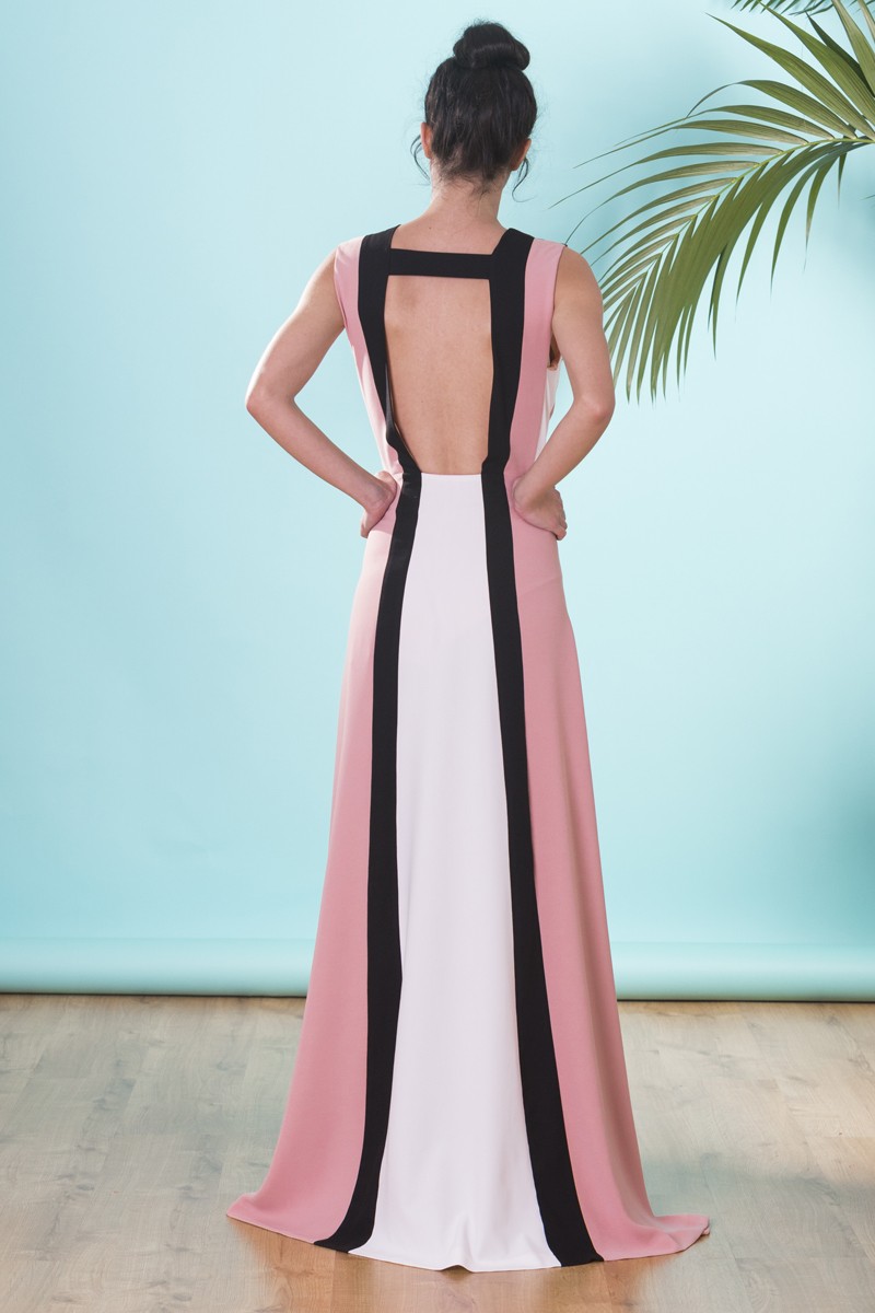 Vestido largo con escote en pico y abertura central confeccionado en crep combinado en color rosa, blanco y negro. (...)