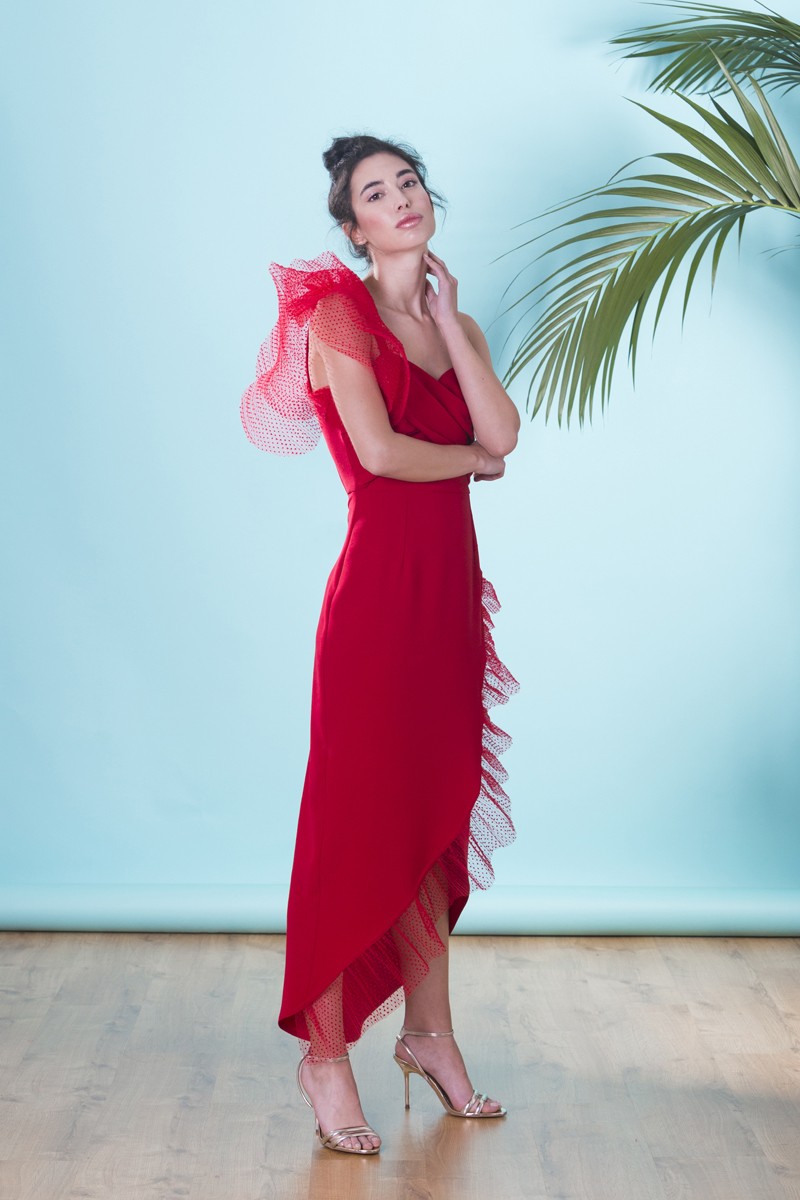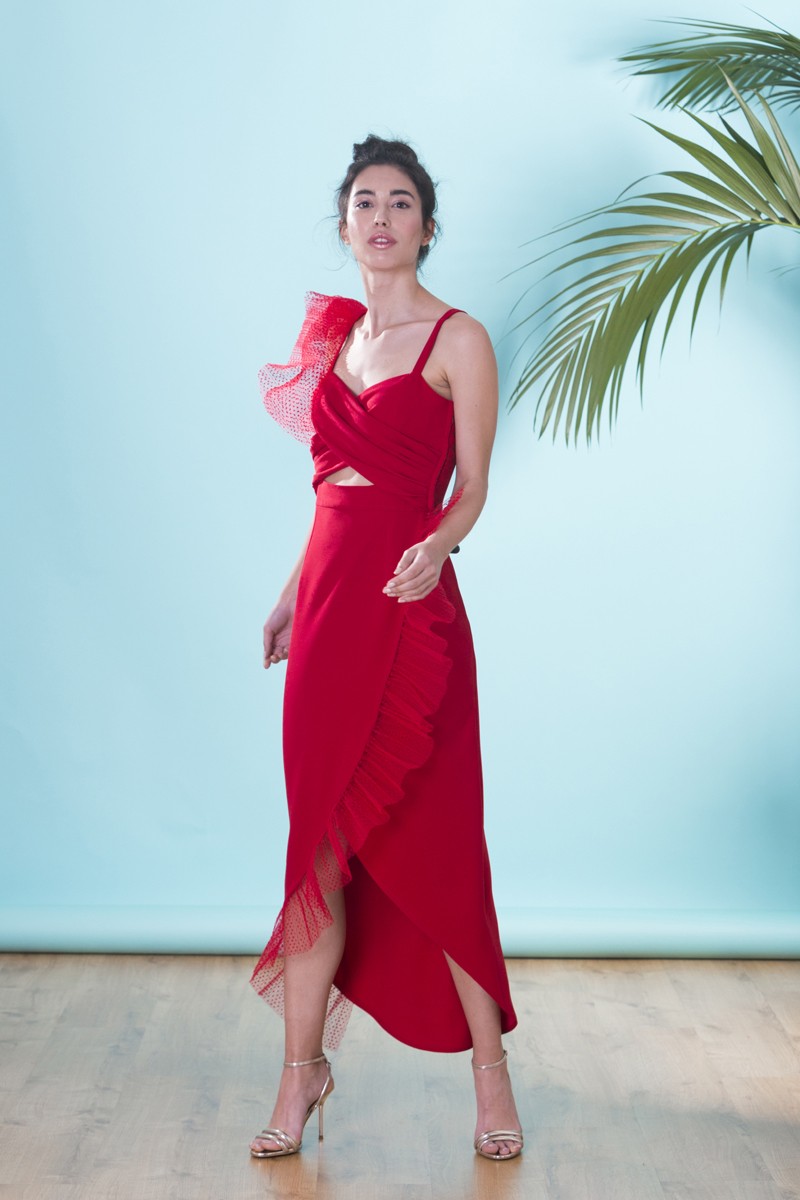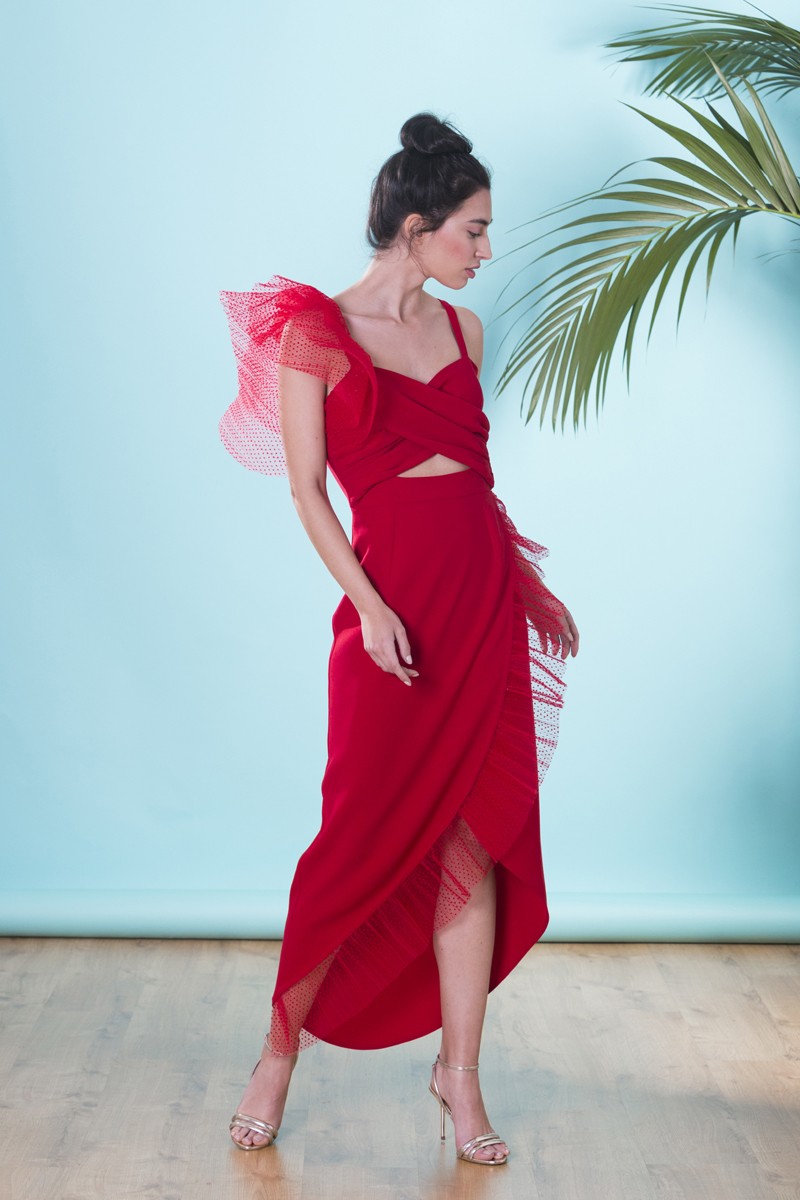 Nuestro precioso vestido Nilo te transportará un mundo de alegría y color. Este precioso vestido de crepe rojo hace el efecto de dos piezas por llevar un bonito cuerpo de escote (...)