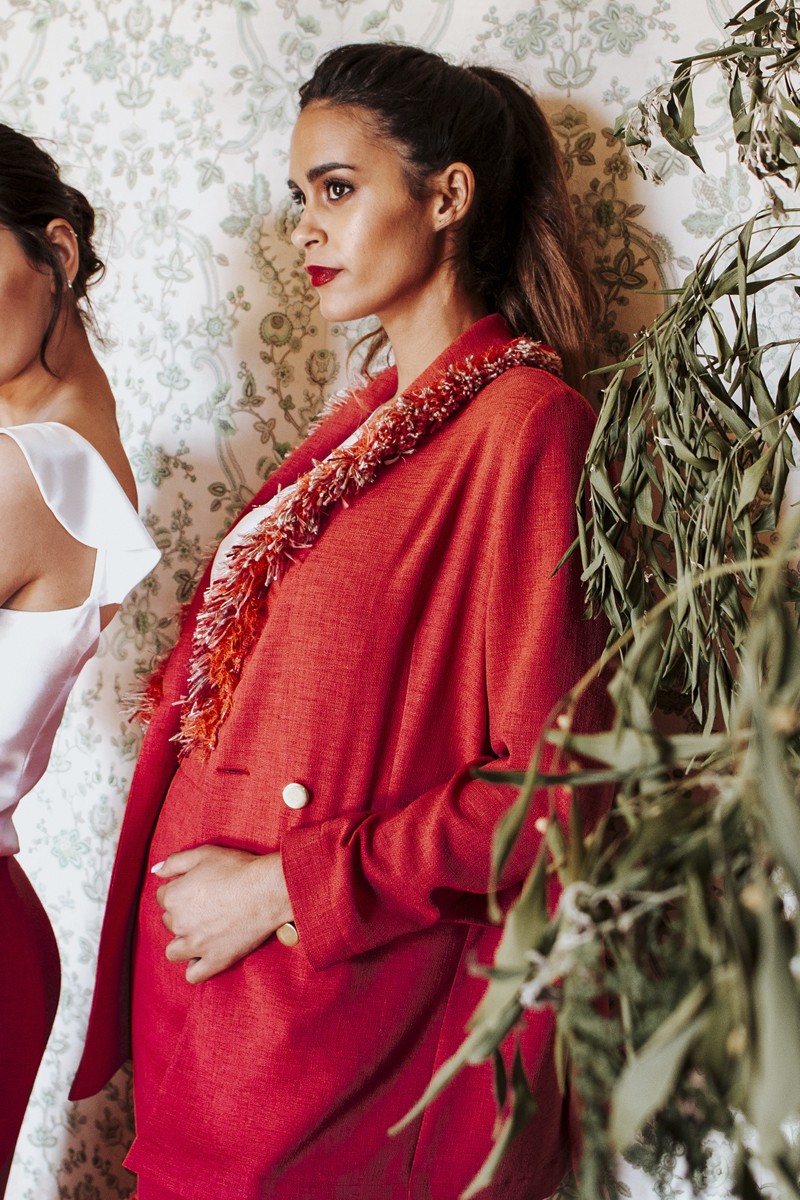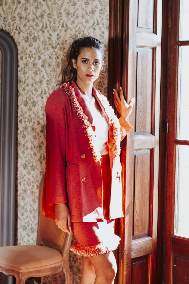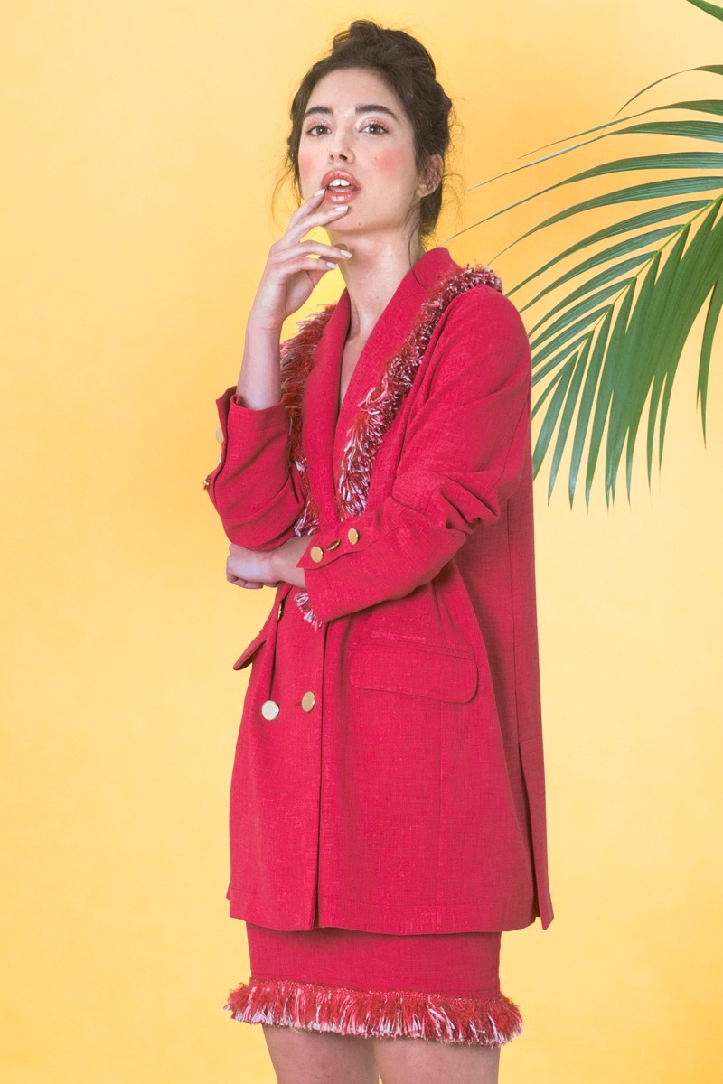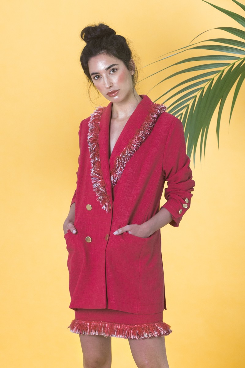 Precioso traje de chaqueta y falda corta en tejido de rafia color fresa coordinado con tira de flecos. (...)