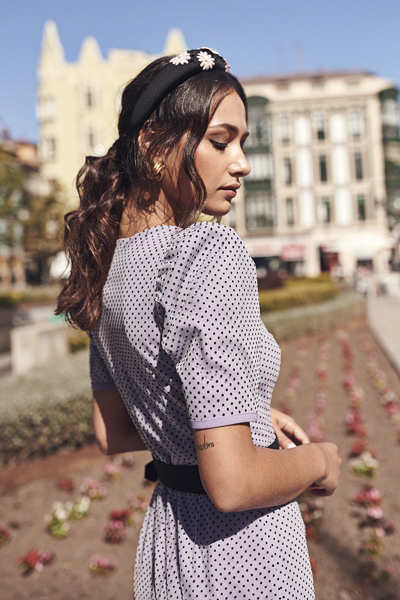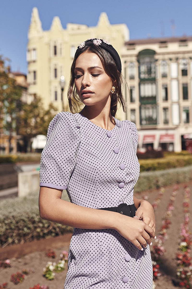 Vestido corto de fiesta confeccionado en crepe lila de gran calidad y plumetti transparente con topos negros. Corte entallado que estiliza y favorece la figura femenina. (...)