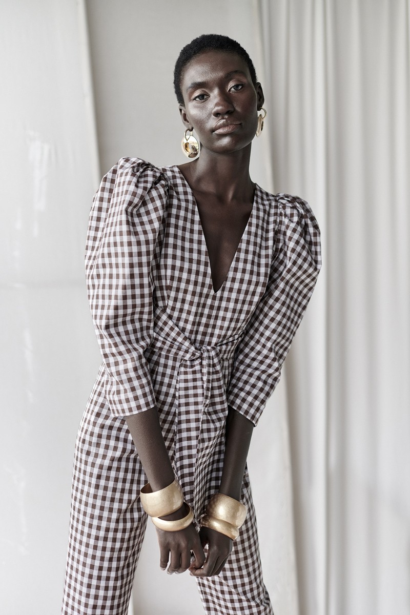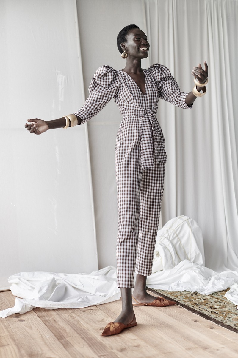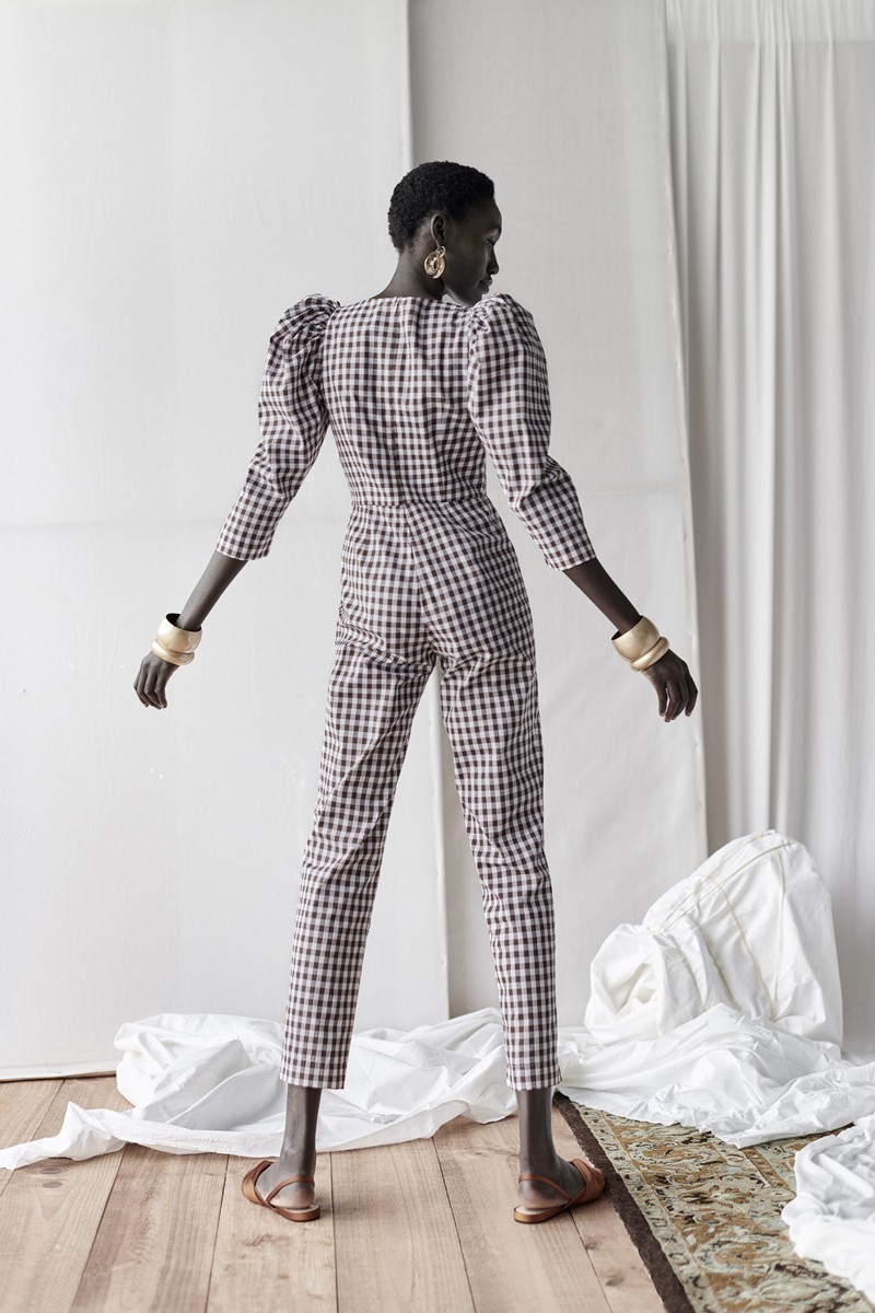 Precioso mono de cuadros vichy blanco y marrón con escote en pico y mangas abullonadas. Lleva cinturón para atar en la parte delantera. (...)