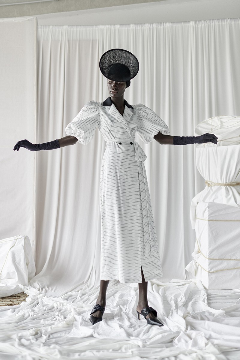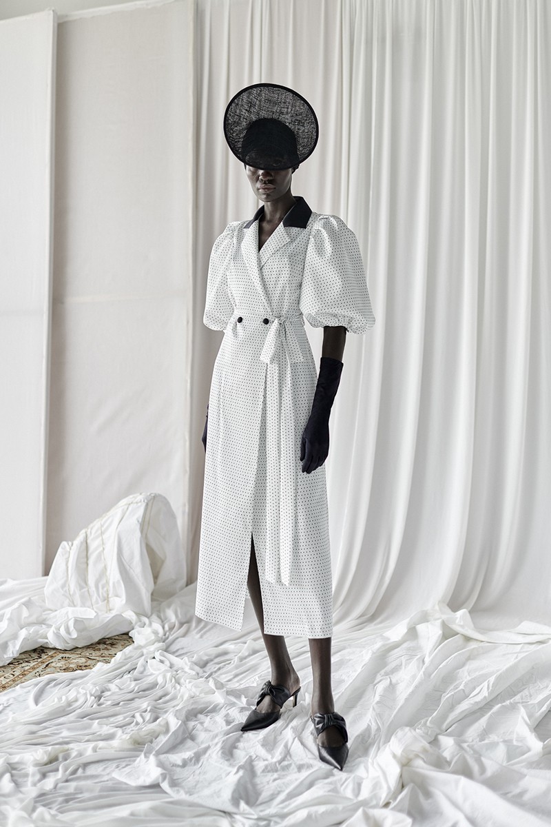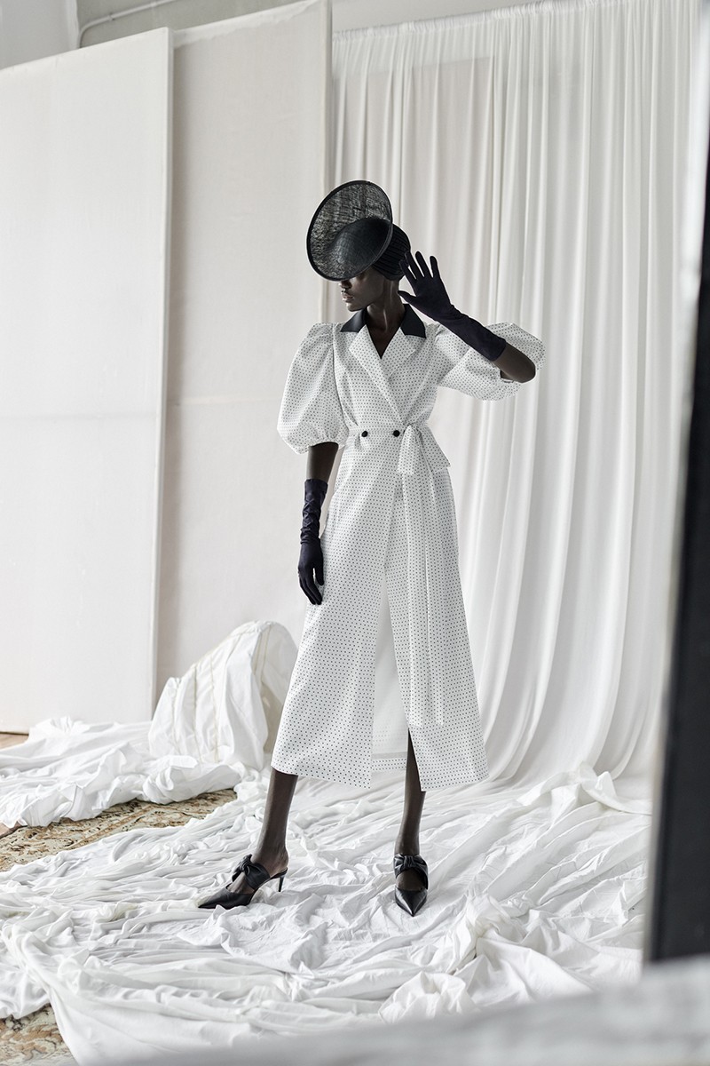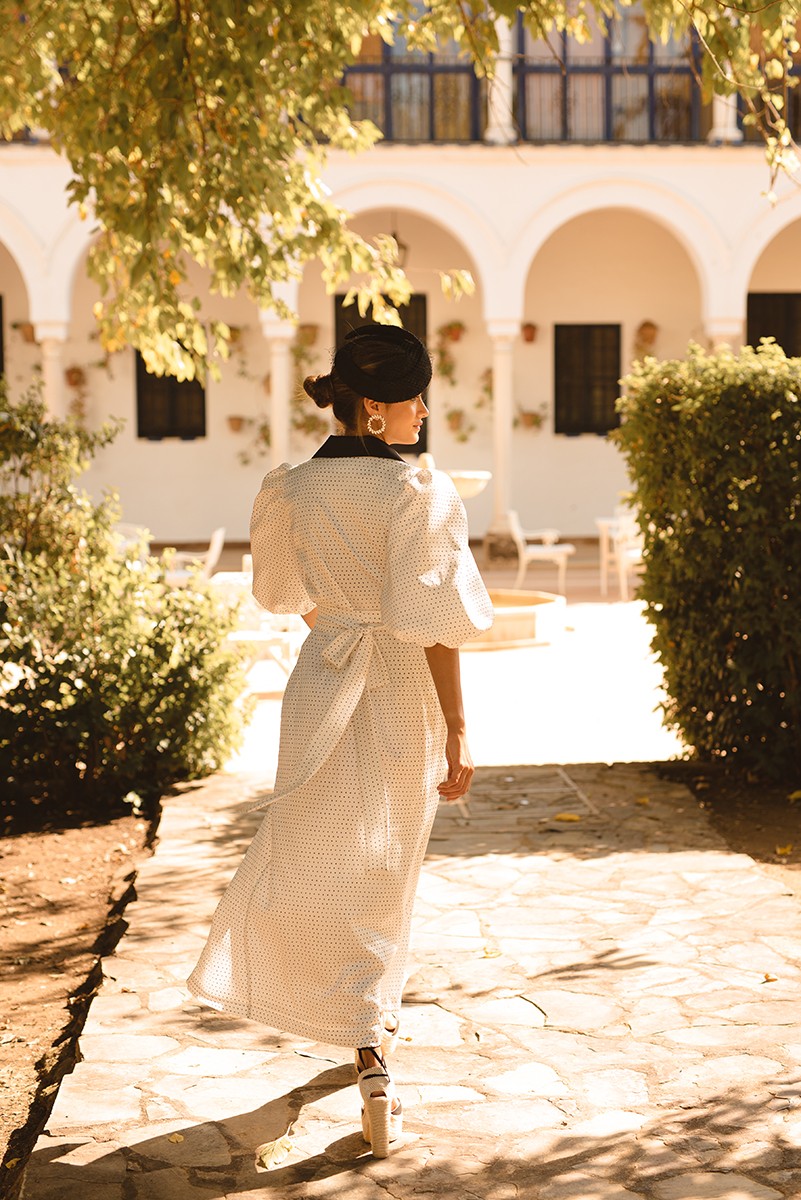 Precioso vestido de fiesta confeccionado en crepe satén blanco con pequeños lunares negros (...)