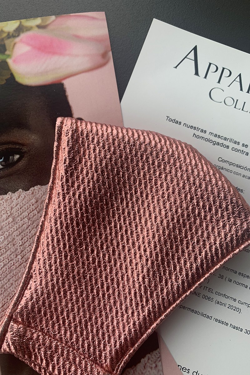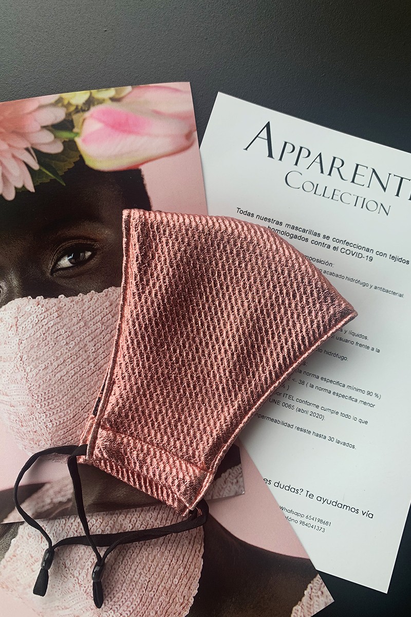 Mascarilla homologada confeccionada en un tejido metalizado en color rosa. Modelo "bozal" con costura vertical central y gomas laterales ajustables. (...)