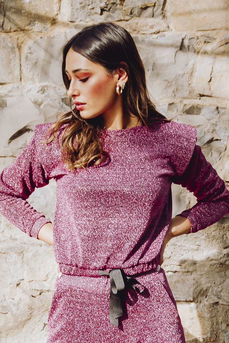 Precioso jersey confeccionado en punto de lúrex color frambuesa con goma en la cintura y cordón de lazo negro para ajustar y darle un toque sport. Viene con detalle en el (...)
