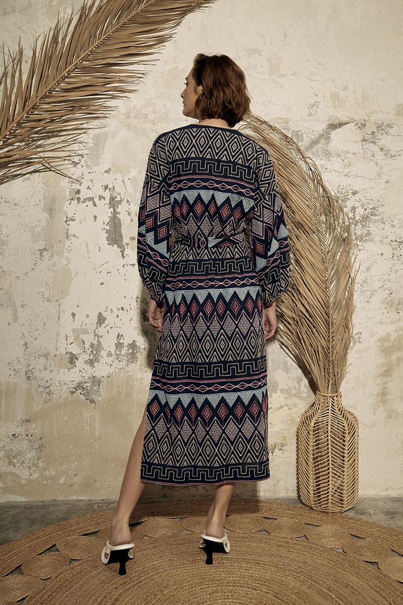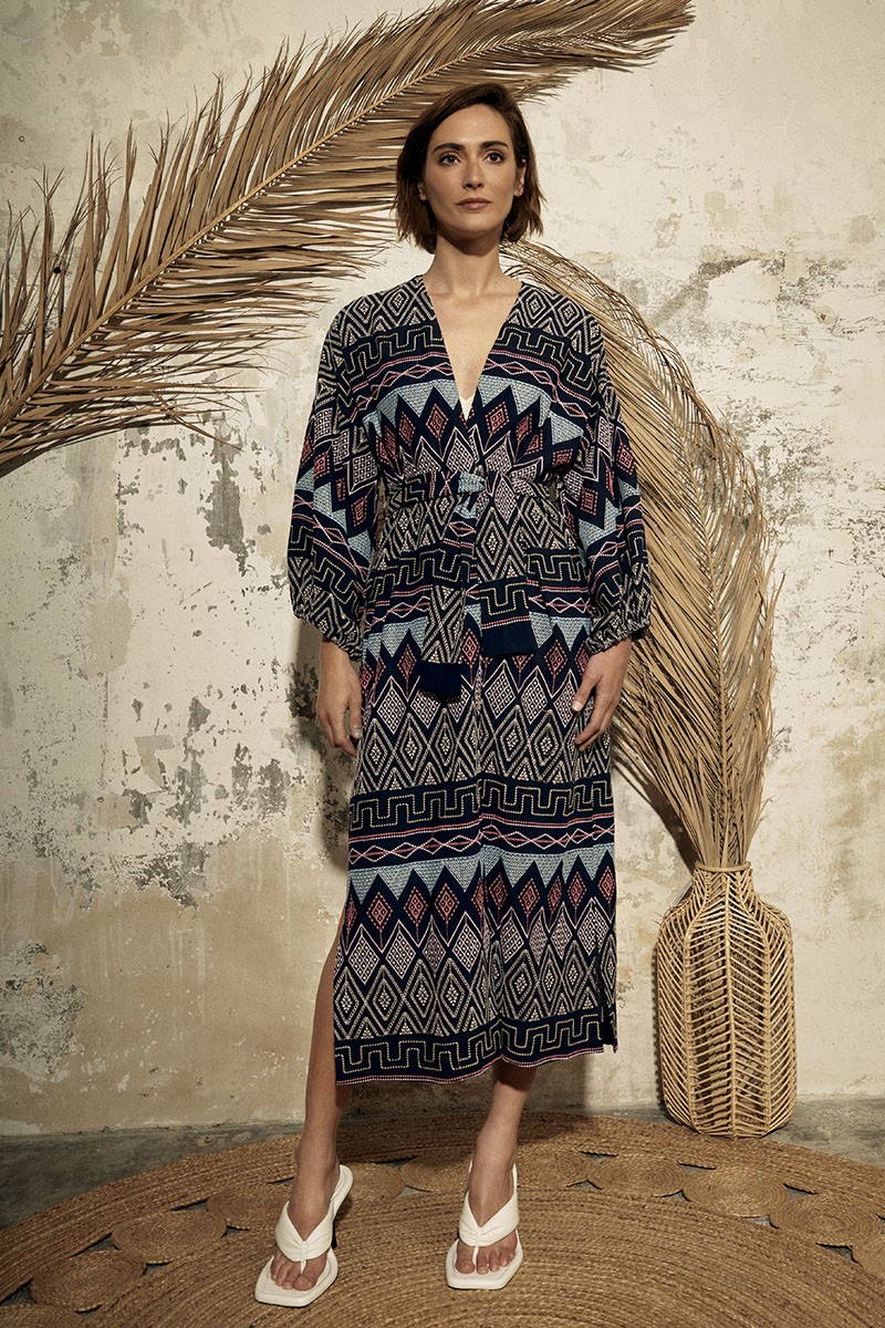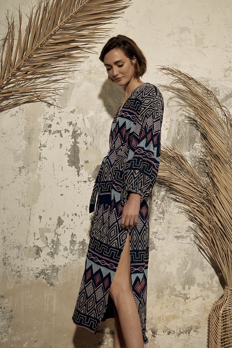 Precioso Kaftan confeccionado en un tejido de algodón con bordados étnicos, base del tejido en color azul con bordados azules, frambuesas, rosas. (...)