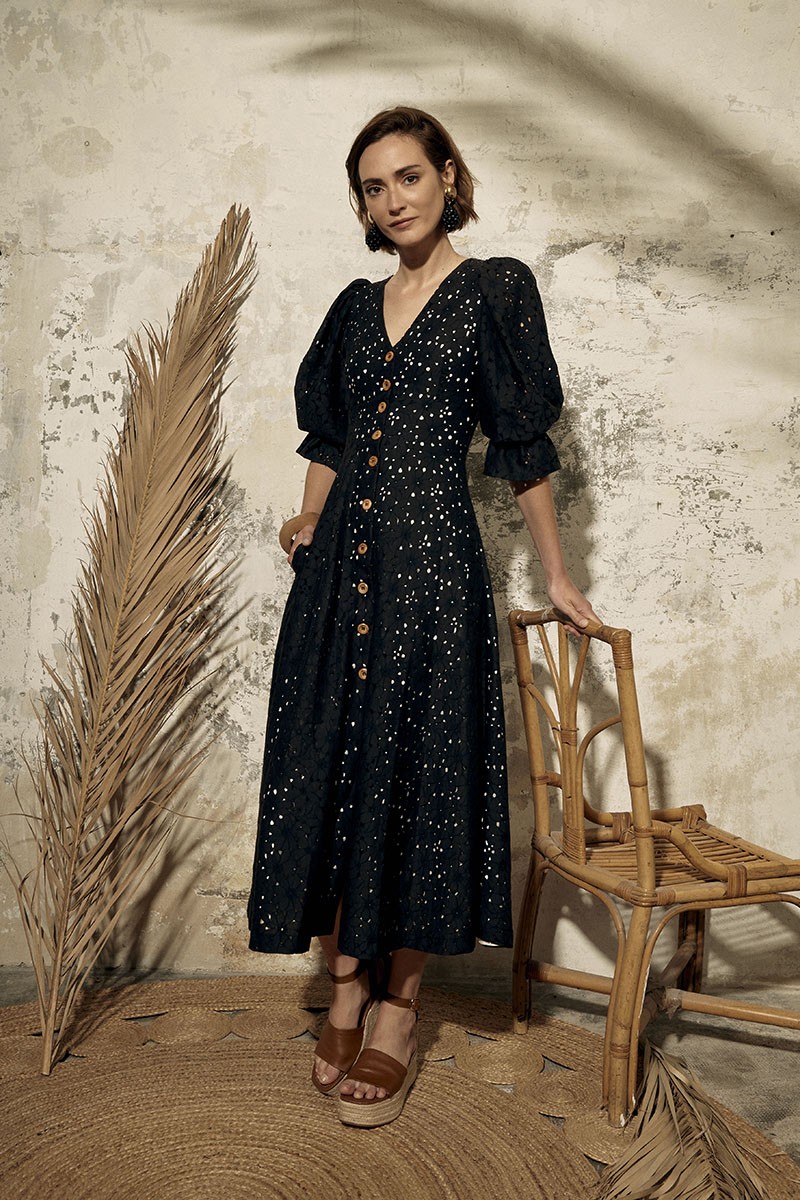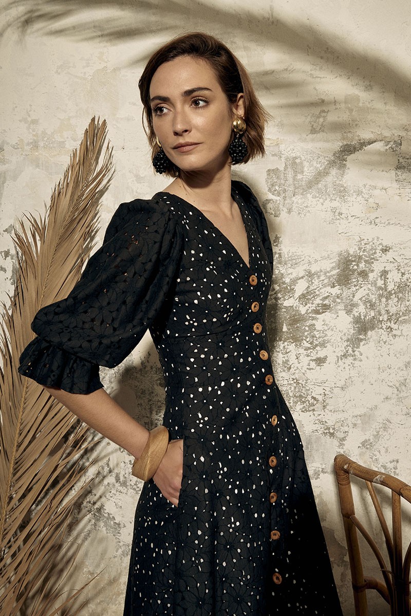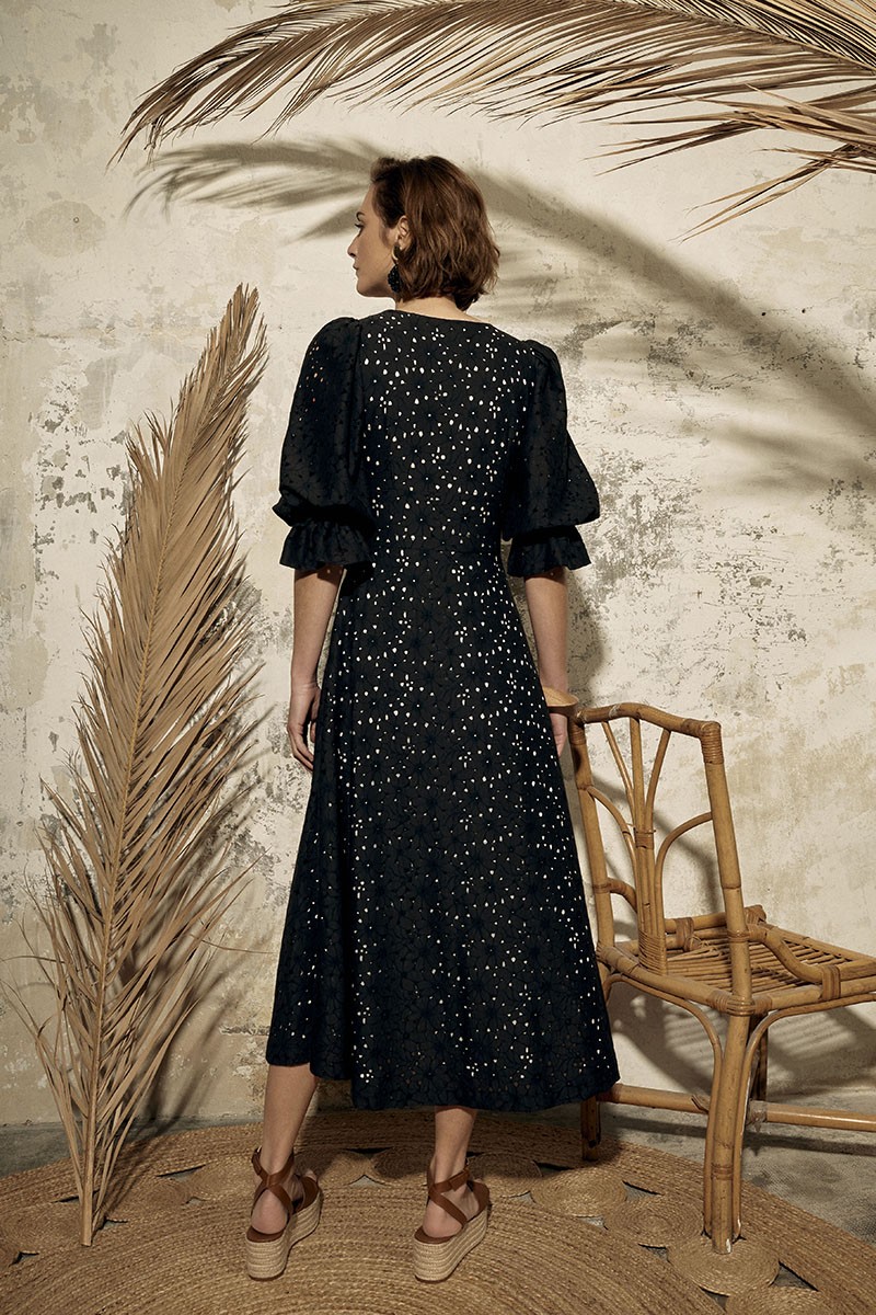Precioso vestido de largo midi confeccionado en un tejido troquelado en color negro de excelente calidad. (...)
