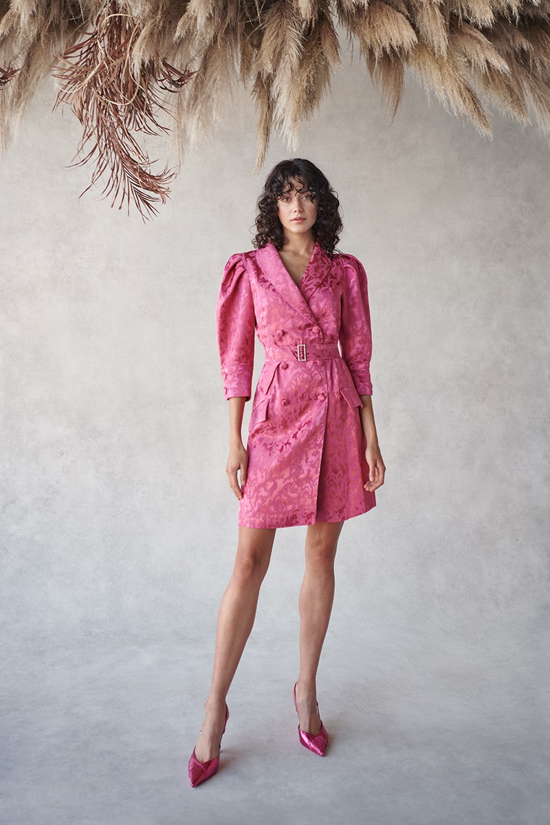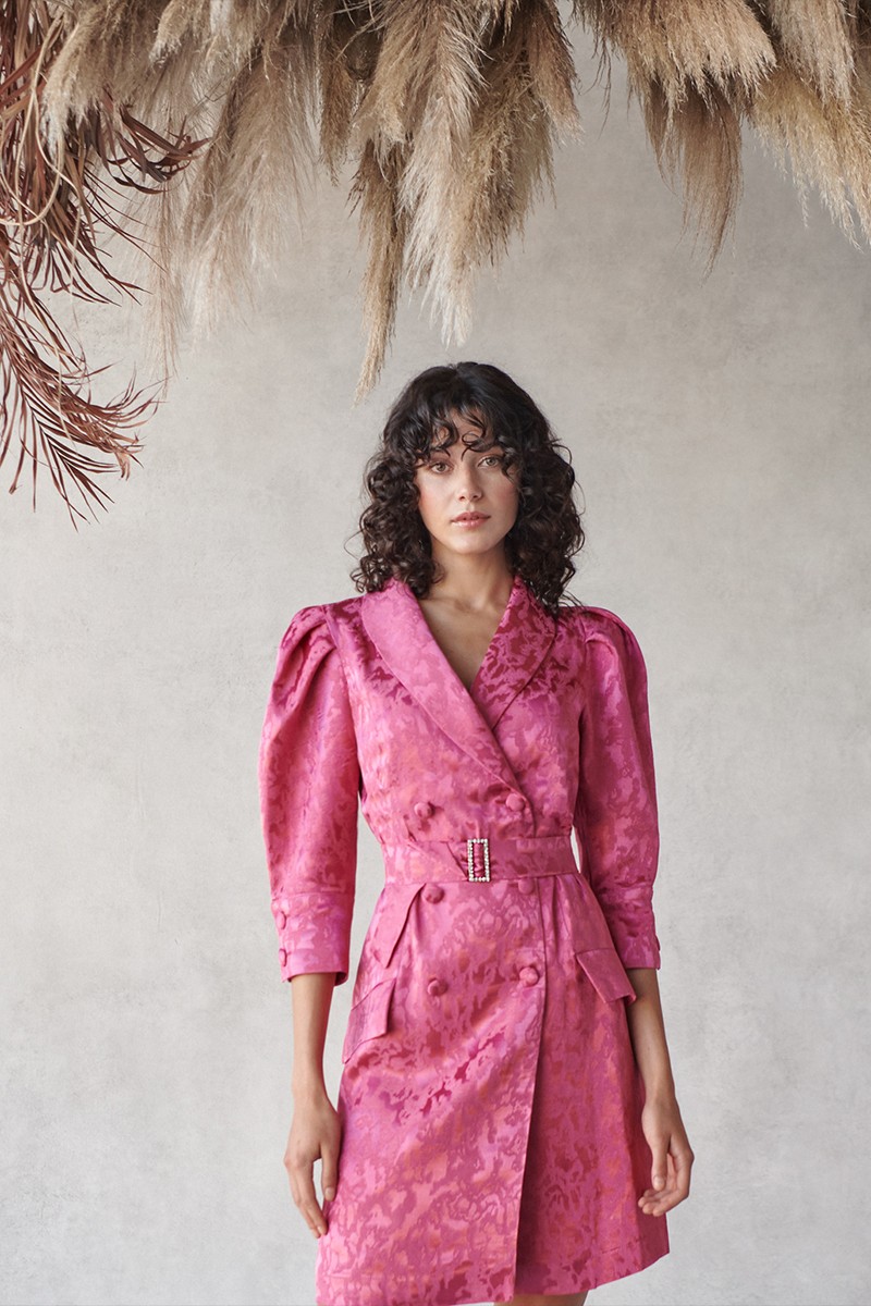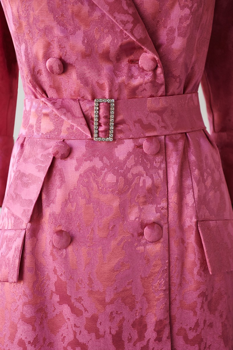 Precioso cinturón joya confeccionado en un tejido tussord color rosa fucsia con dibujos tornasolado. (...)