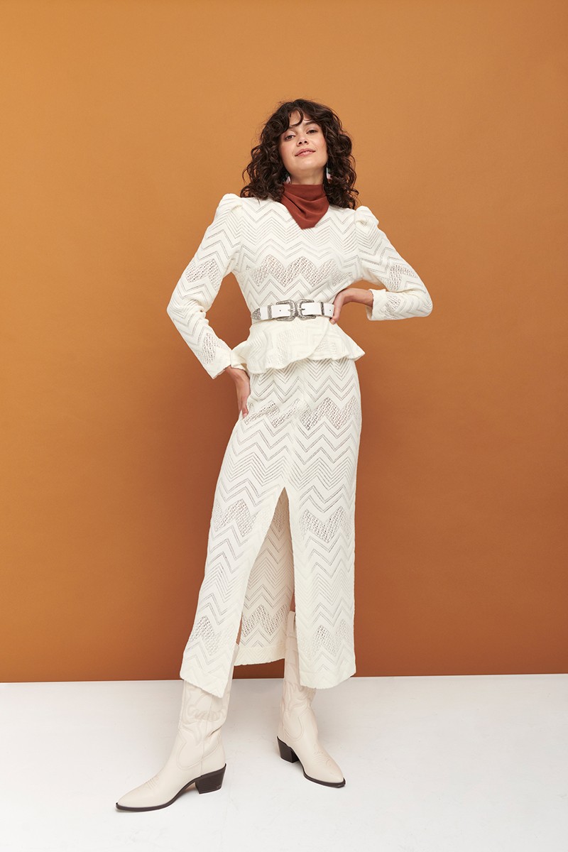 Precioso conjunto de jersey y falda confeccionado en un tejido de punto calado con dibujos de zig zag blanco.Tejido de gran calidad (...)
