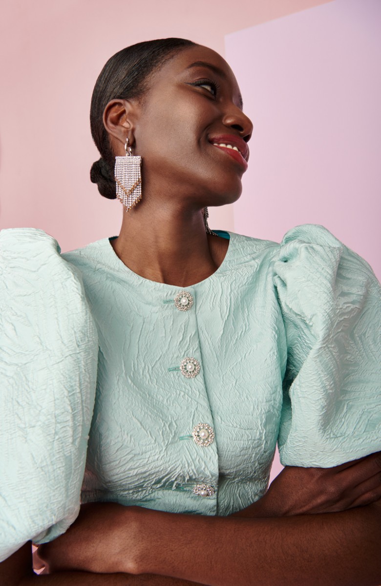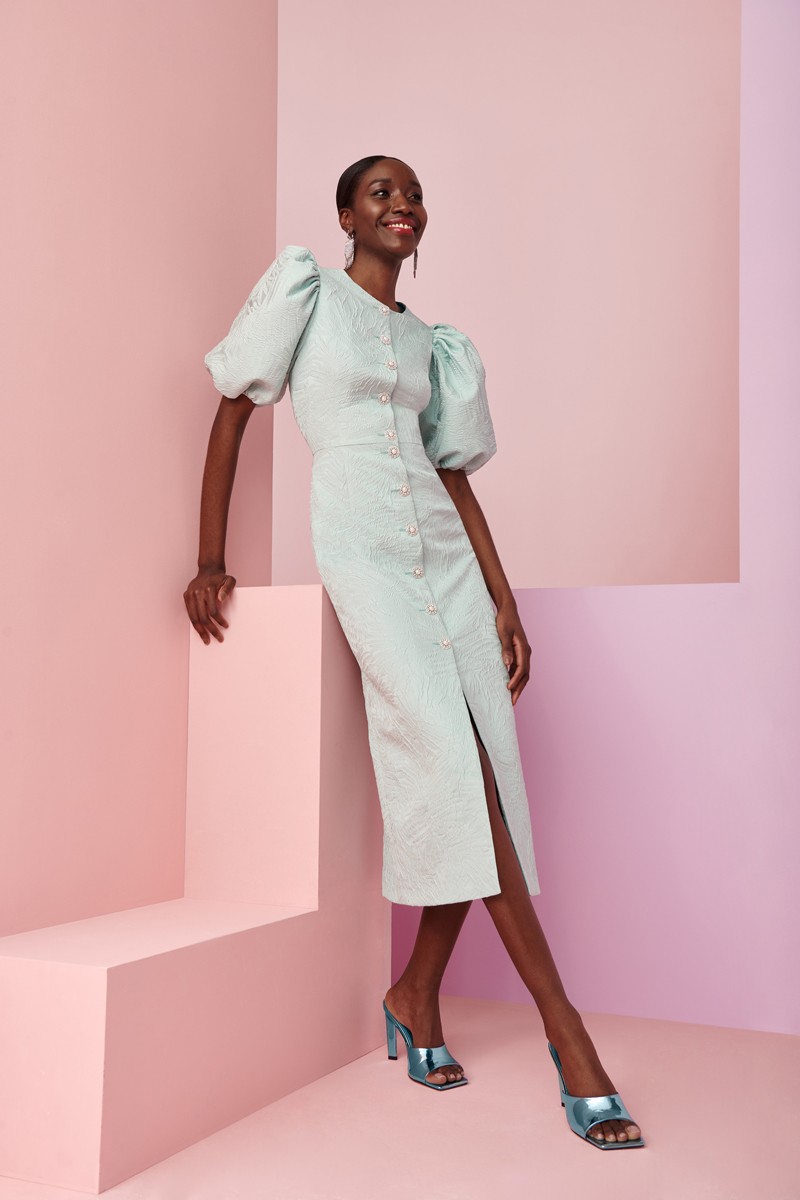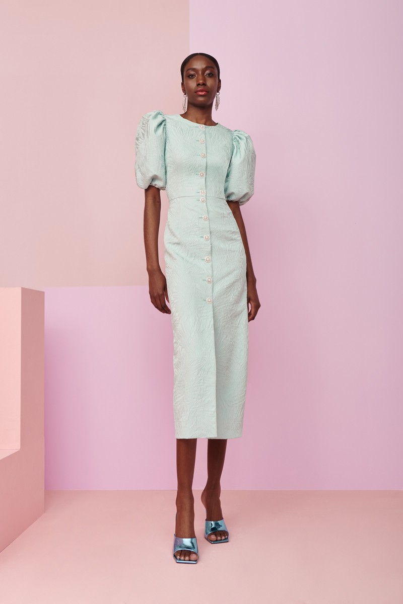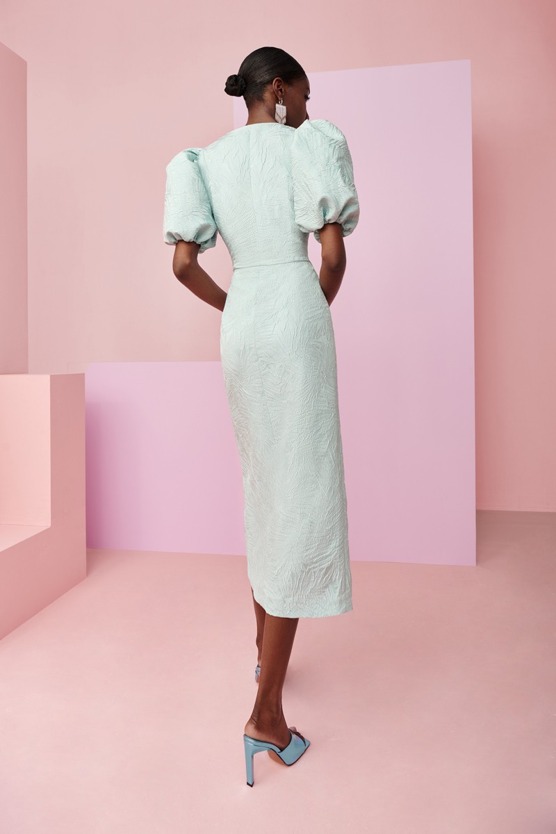 Precioso vestido midi confeccionado en un tejido brocado de gran calidad en color aguamarina. (...)