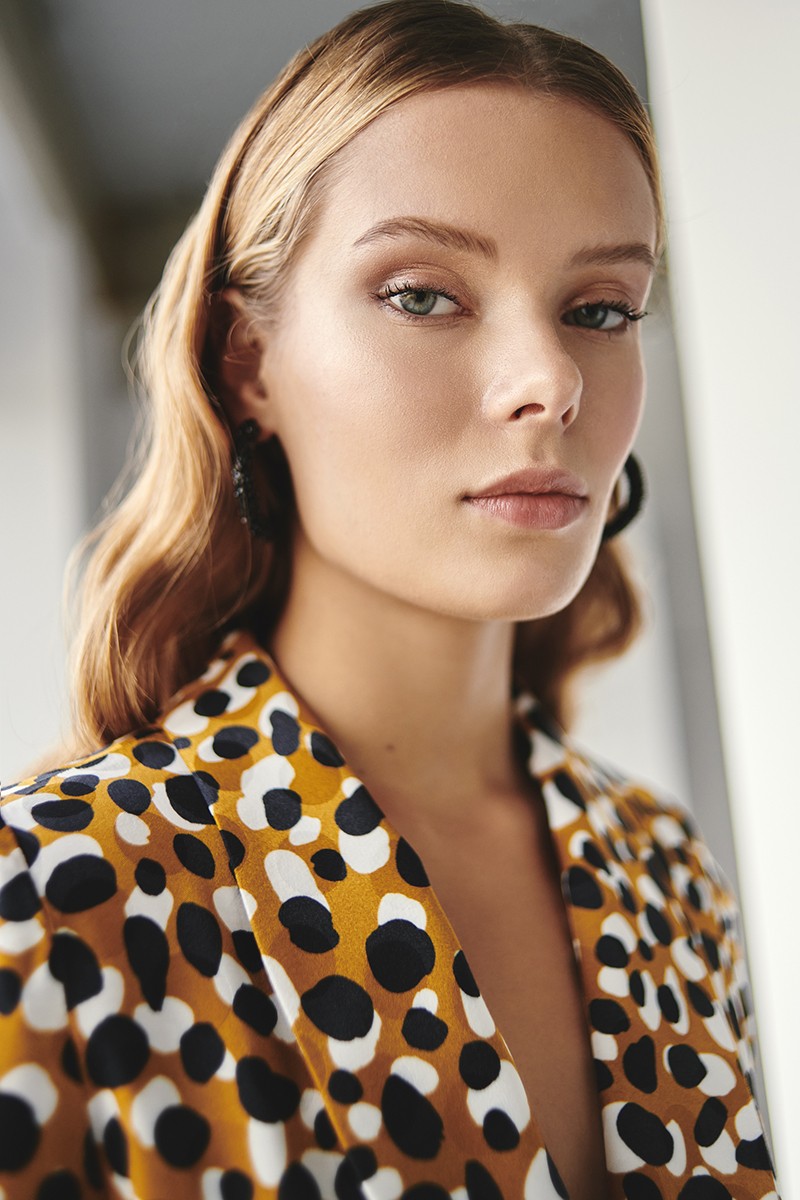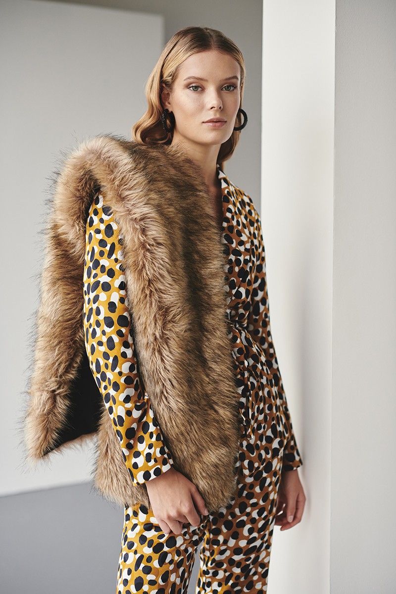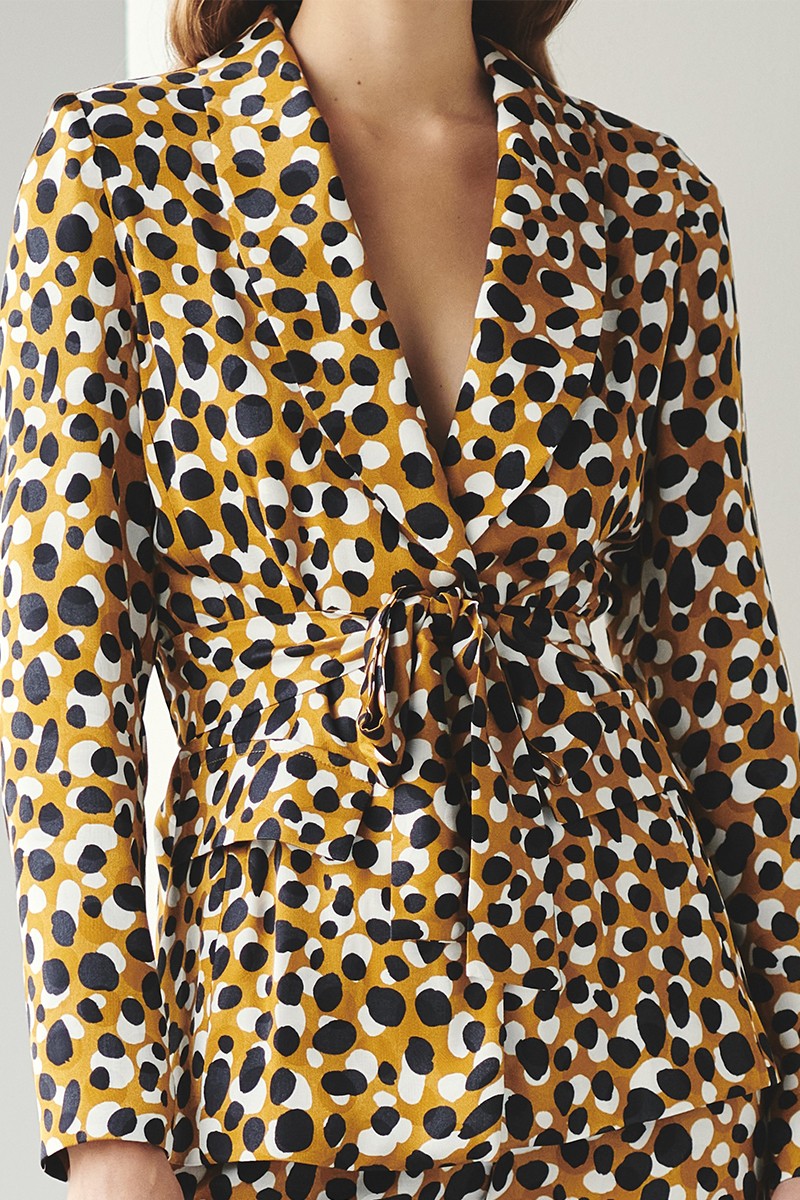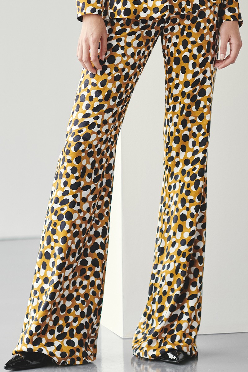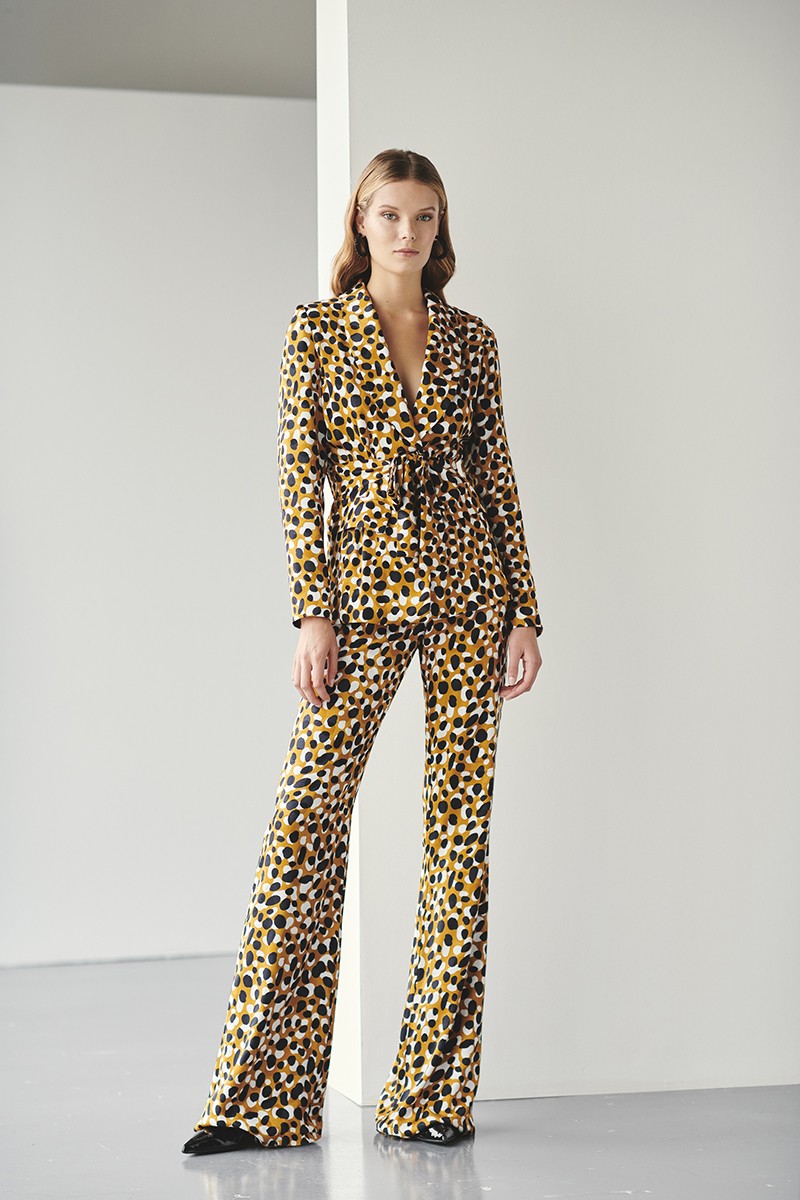 Traje formado por dos piezas, chaqueta y pantalón, confeccionado en un precioso tejido de crepe estampado en base de color mostaza con estampados en blanco y negro. Dibujo similar a (...)
