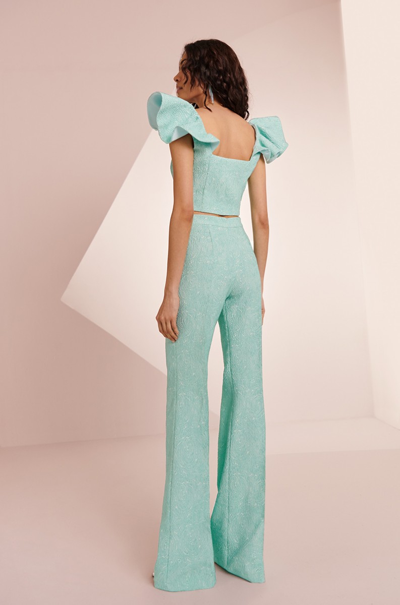 Pantalón de tiro alto brocado en color aguamarina, ligeramente más ajustado en la zona del muslo, que estiliza y enmarca la cintura.Cierre lateral con cremallera. (...)