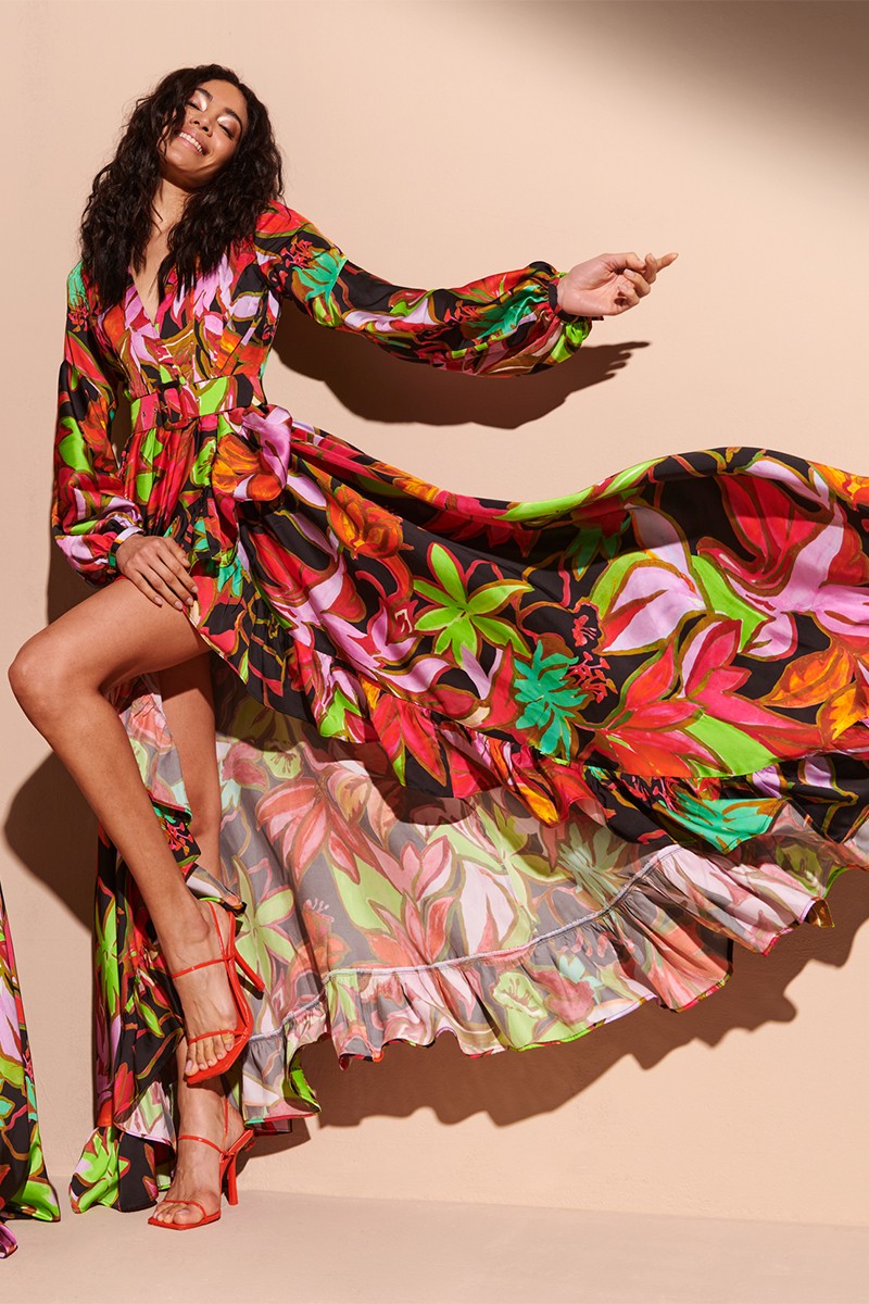 Impresionante vestido largo confeccionado en crepe satén estampado en negro con flores en tonos verde, rosa, lisa, naraja... (...)