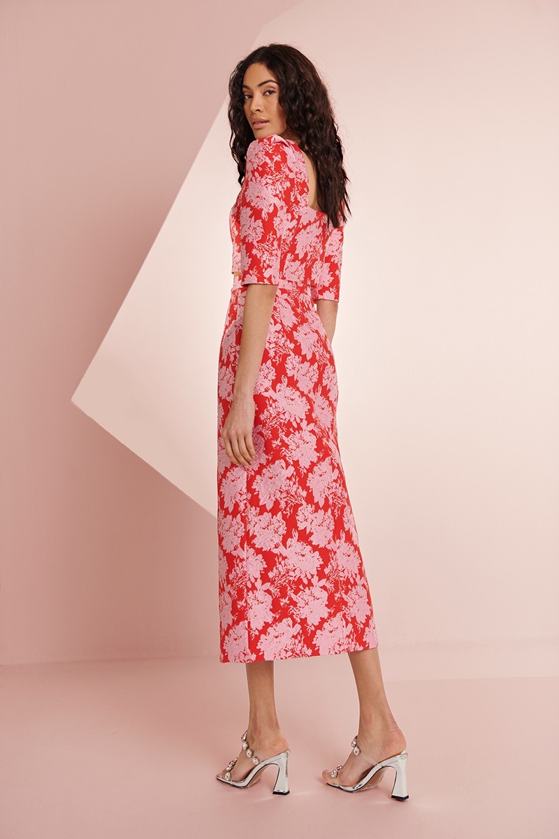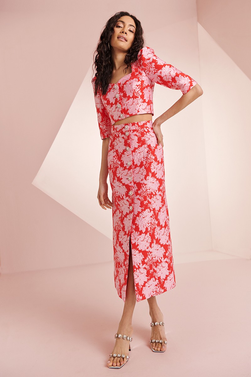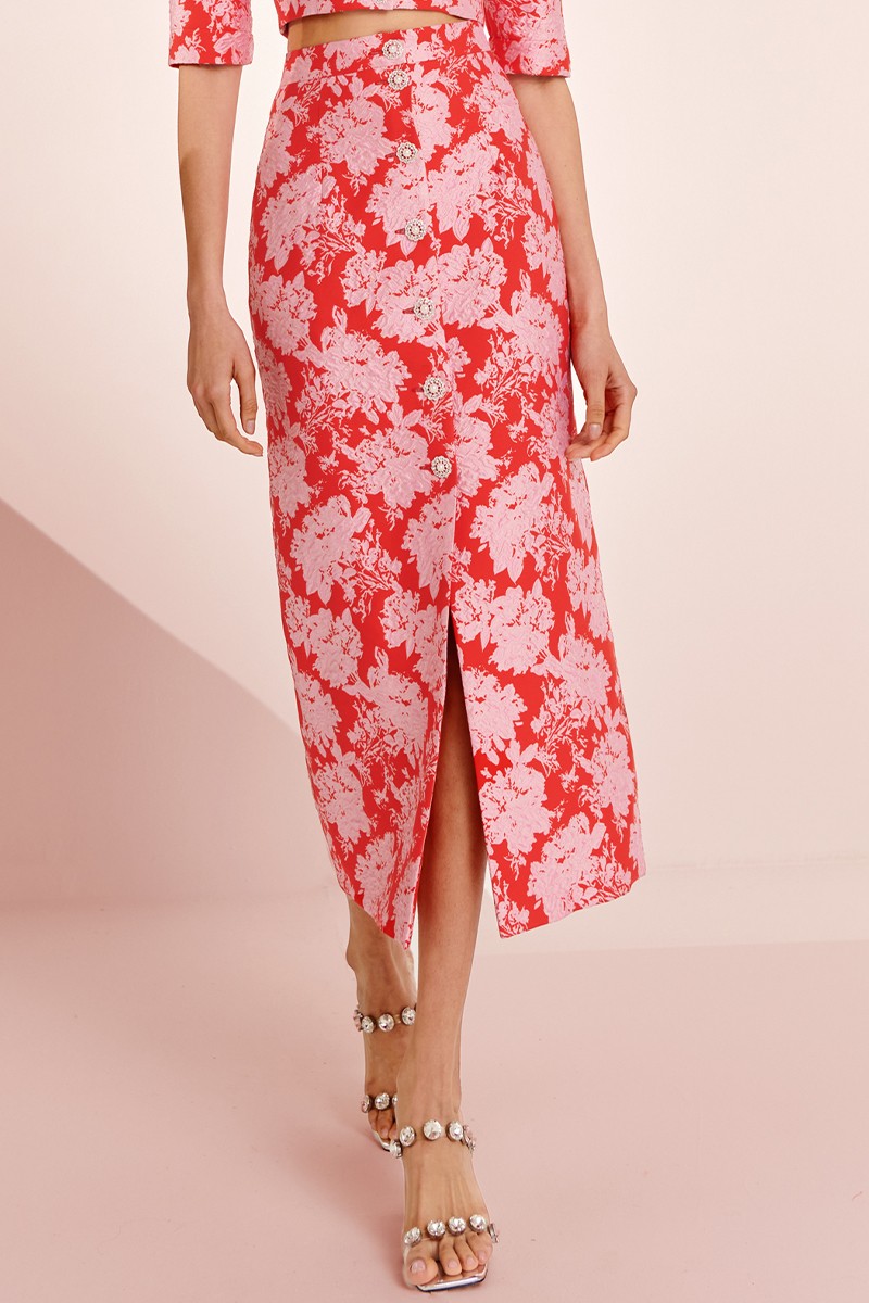 Preciosa falda confeccionada en tejido de jacquard de gran calidad color rojo con dibujo de flores en relieve de color rosa. (...)