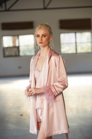 Este bello conjunto está confeccionado en satén color beige claro con brillo de alta calidad.