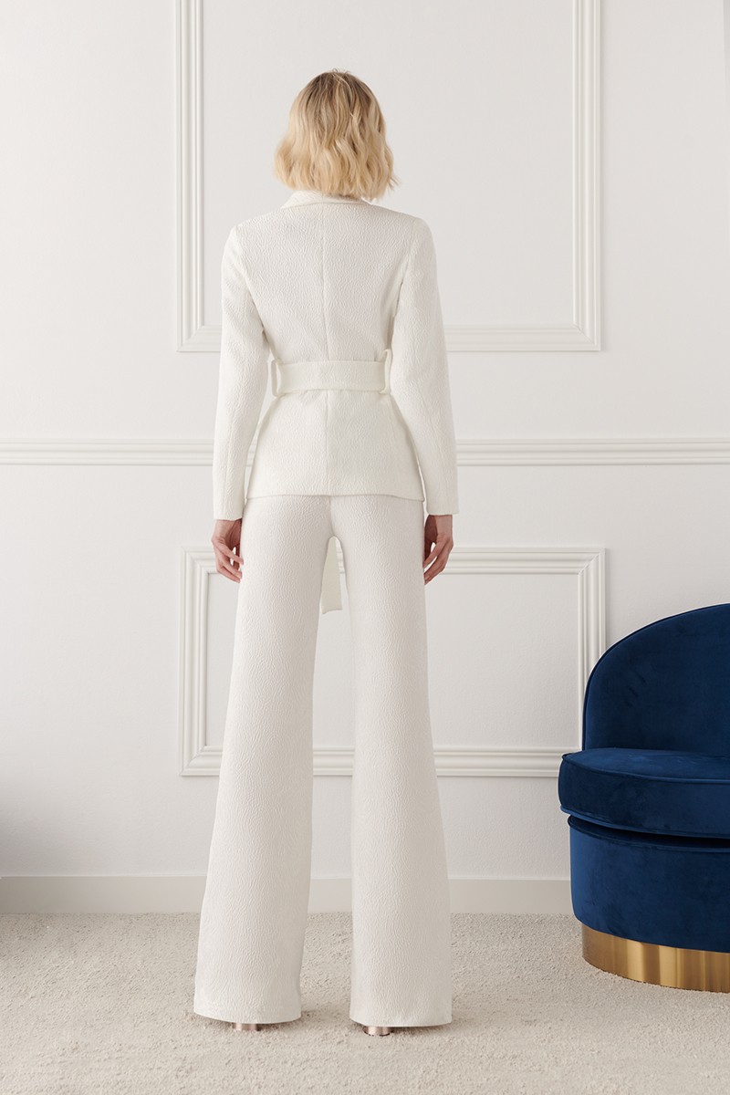 Traje formado por dos piezas, chaqueta y pantalón, confeccionado en un precioso tejido jacquard brocaado elástico en color blanco. (...)