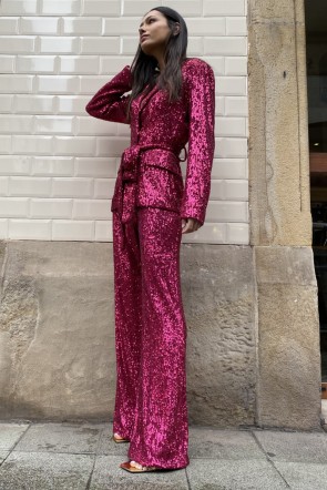 Elegante pantalón estrecho confeccionado en crepe de color rojo con volante de forma asimétrica que comienza más abajo de la rodilla y llega a alcanzar la altura del tobillo. (...)