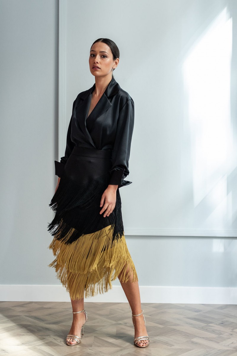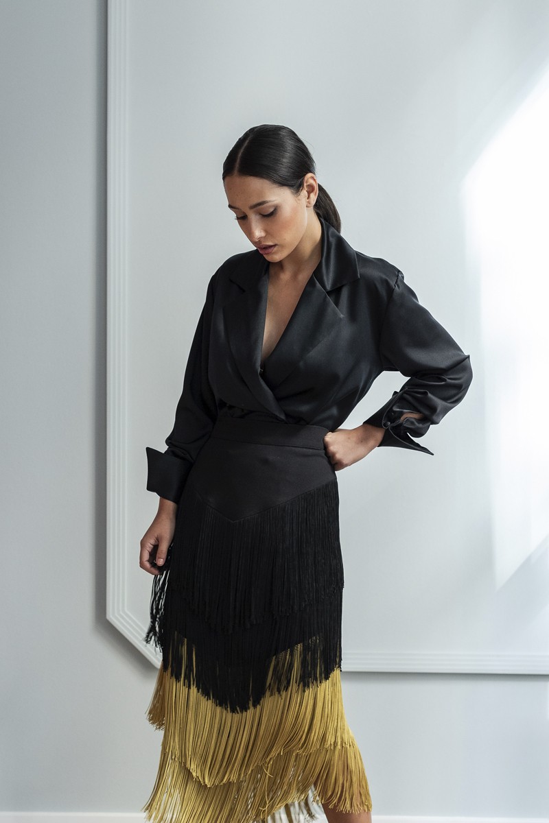 Preciosa camisa confeccionado en satén de color negro de corte esmoquin. Una elegante camisa americana con escote en pico y cuello con solapa de manga larga con puños de gemelo con (...)